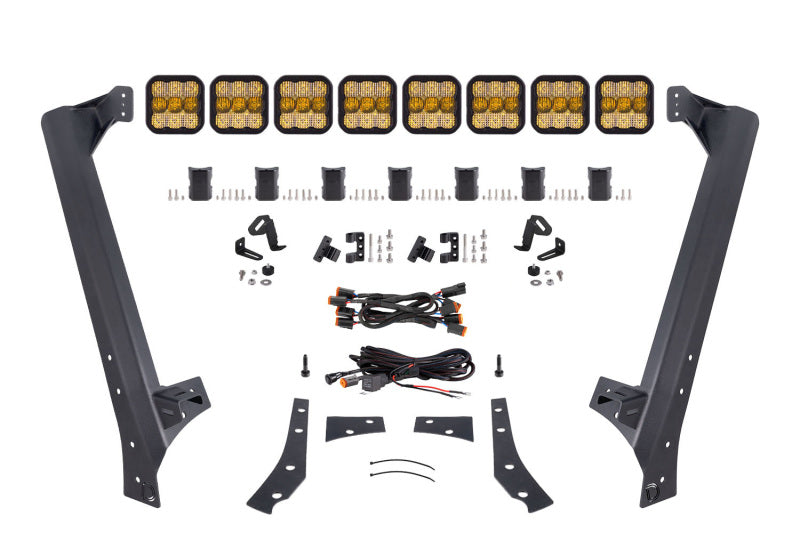DD7225 Diode Dynamics 07-18 Jeep Wrangler JK SS5 Sport CrossLink Windshield Lightbar Kit Yellow Combo. This bolt-on lightbar kit features eight ultra-high intensity SS5 LED pods with custom-engineered TIR optics for superior illumination. Designed for perfect fitment with no drilling required, it mounts above the factory windshield using factory points. The selectable amber backlight adds unique styling and enhanced visibility. Built with heavy-duty, torture-tested construction and controlled via the factory aux switch, this USA-assembled kit offers rugged performance and easy installation for Jeep JK owners seeking reliable, powerful lighting.