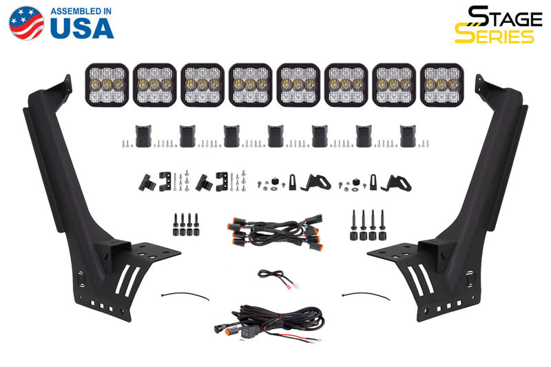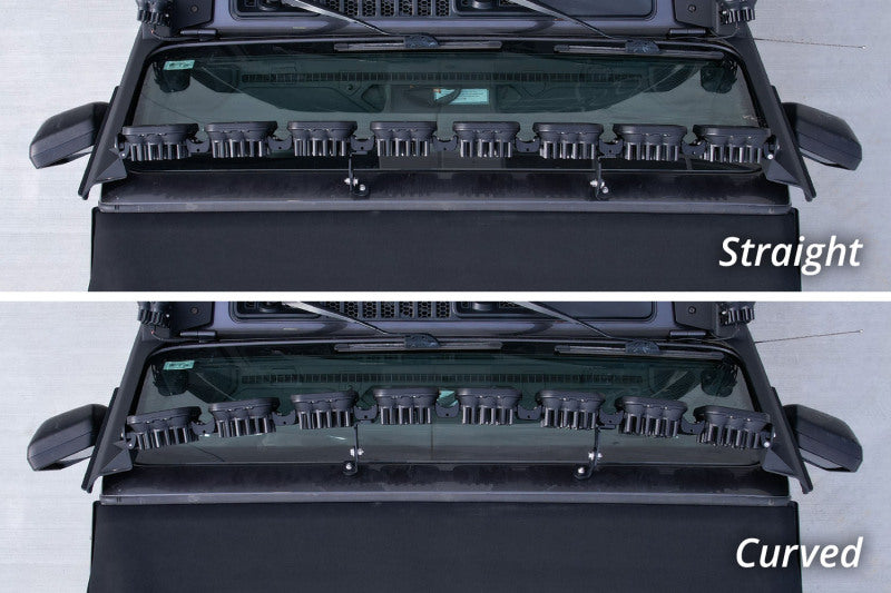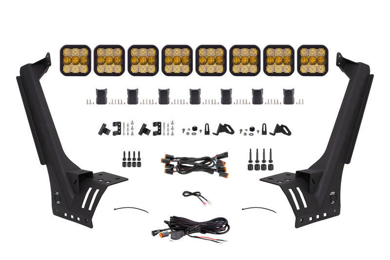 DD6822 Diode Dynamics 18-26 Jeep Wrangler JL & 20-24 Gladiator JT SS5 Sport CrossLink Windshield Lightbar Kit Yellow. This bolt-on lightbar kit features eight ultra-high intensity SS5 LED pods with custom-engineered TIR optics for maximum brightness and durability. Designed for perfect fitment with no drilling required, it includes selectable amber backlight for added style and visibility. The patent-pending CrossLink technology allows adjustable configurations, while the heavy-duty construction ensures long-lasting performance. Control is seamless via the factory aux switch bank using the included harness. Assembled in the USA for quality assurance.