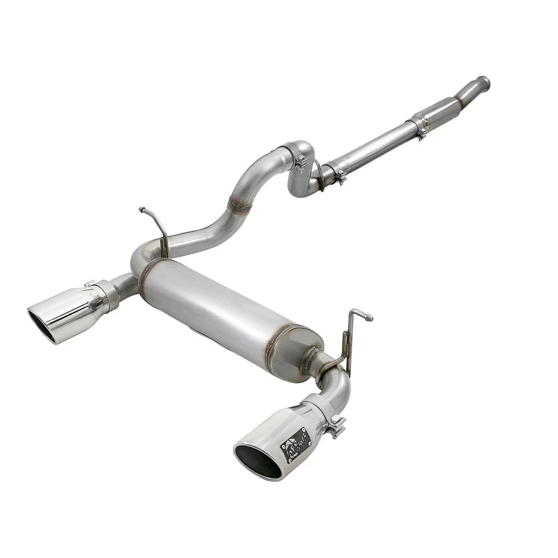 AFE 49-48096-P Rebel Series Cat-Back Exhaust System (Polished Tips) for 18-25 Jeep Wrangler 2.0L. Upgrade your ride with this exhaust system, crafted from 3 IN - 2-1/2 IN mandrel-bent 409 stainless steel tubing. It features dual 4-1/2 IN diameter polished 304 stainless steel clamp-on tips and uses factory-style hangers for a secure and precise fit.