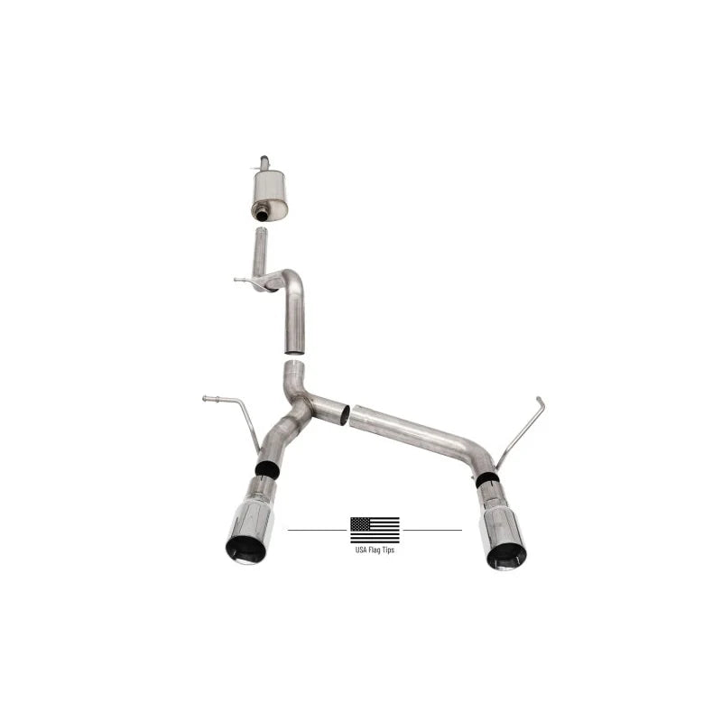 The CORSA Performance JK catback exhaust system features CORSA's Patented Reflective Sound Cancellation(R) (RSC) Technology allows acoustic engineers to create an aggressive drone free exhaust note, styled specifically to fit the personality of your vehicle. This JK catback exhaust system moves the muffler to the center of the vehicle providing for better clearance and maximum approach angles for offroad driving. CORSA's full catback exhaust allowed our acoustic engineers to get added deep tonality from the V6 engine creating and AGGRESSIVE V8 LIKE SOUND under acceleration while maintaininig a DRONE-FREE EXPERIENCE during cruise. Choose from 4 unique tip options: Dump-style for maximum offroad clearance, polished, black or our American Flag option. Performance gains are not affected by sound choice.