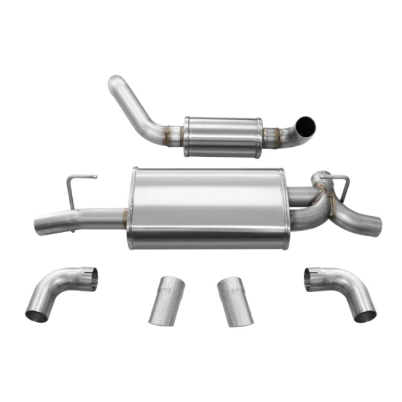 Corsa 21015 Touring Axle-Back Exhaust System (Turn Down Exit) for 18-25 Jeep Wrangler JL (2.0L I4 / 3.6L V6). CORSA’s Patented RSC™ Technology delivers a deep, aggressive rumble and drone-free sound, while its mandrel-bent, straight-through design maximizes airflow for improved fuel economy and performance.