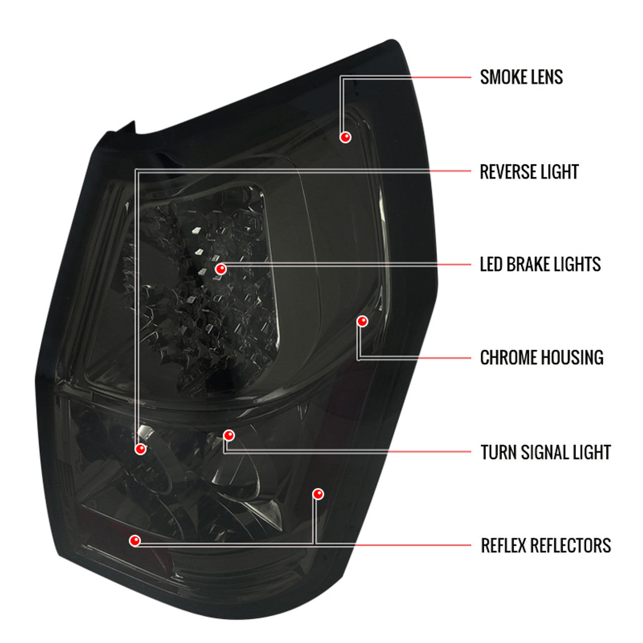 LT-MAG05GLED-TM Spec D 05-08 Dodge Magnum LED Tail Lights (Smoke). Upgrade your Dodge Magnum with these Spec D LED Tail Lights featuring a sleek smoke lens and chrome housing. Designed for a direct plug-and-play installation with pre-assembled wiring, they offer enhanced visibility and a modern look. Manufactured to meet strict OEM standards by an ISO certified company, these tail lights ensure durability and reliability. Bulbs for turn signals and reverse lights are not included, allowing you to use your stock components for seamless integration. Professional installation is recommended for optimal performance.