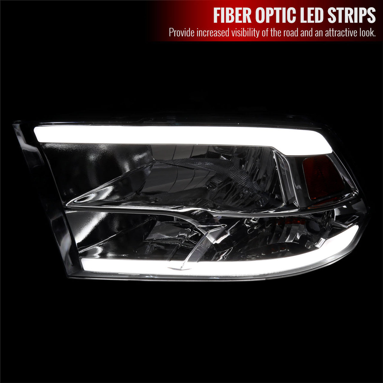 2LH-DGP09Q-G3-GO Spec D 09-18 Dodge Ram OEM Style Headlights w/ LED Bar (Chrome). Upgrade your Dodge Ram with these factory-style LED tube headlights featuring a chrome housing and clear lens for a sleek, modern look. Designed to meet strict OEM standards, they offer direct bolt-on installation for models with non-projector headlights. The amber reflector enhances visibility and safety, while the LED bar adds a distinctive touch. Bulbs are not included; use stock bulbs for installation. Perfect for restoring or enhancing your Ram’s front-end appearance with reliable, high-quality lighting.