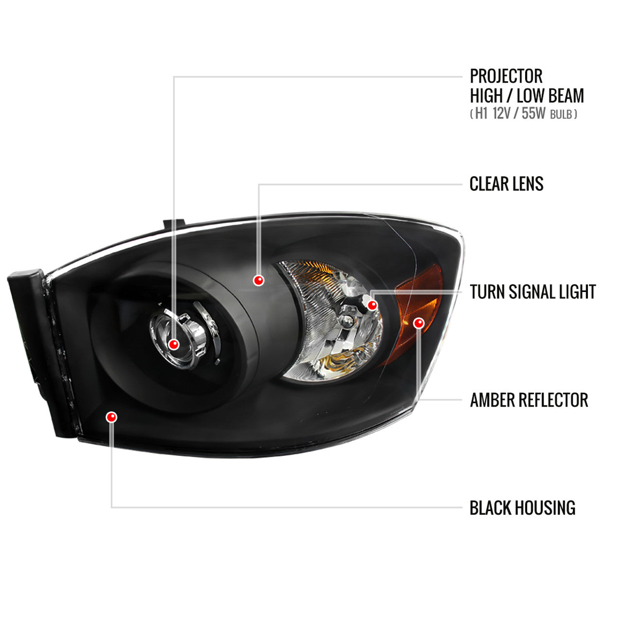 2LHP-DGP06JM-RS Spec D 06-10 Dodge Ram Projector Halo Headlights (Black). Upgrade your 06-10 Dodge Ram with these sleek black housing projector halo headlights. Featuring clear lenses and amber reflectors, they include H1 bulbs for the projector beam, ensuring bright and focused illumination. Manufactured to meet strict OEM standards by an ISO certified company, these headlights offer durability and style. Easy to install using stock bulbs and wiring, they enhance both the look and safety of your truck. Professional installation is recommended for optimal performance.