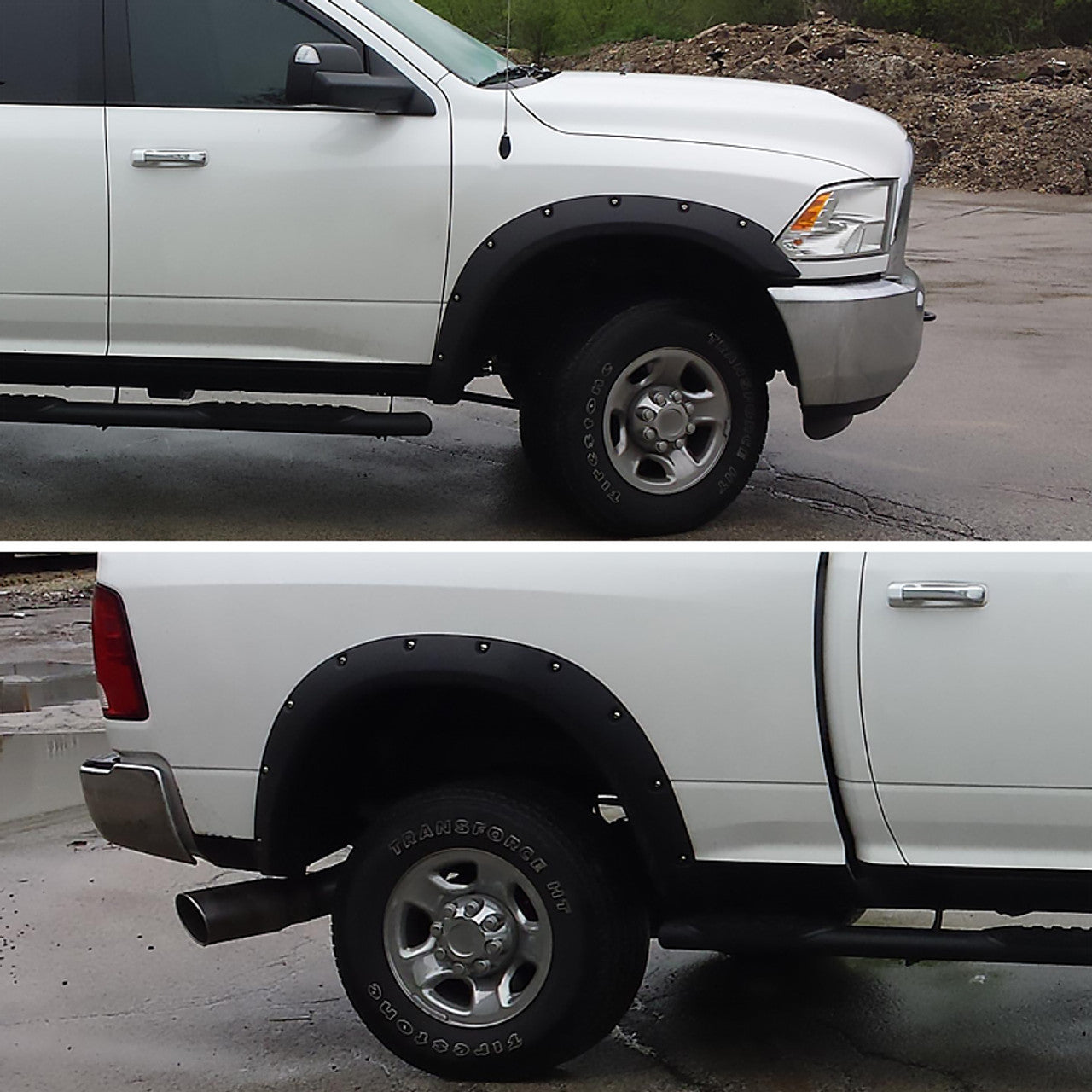 FDF-RAM1025A-PK-MP Spec D 10-18 Dodge Ram 2500 / 3500 Riveted Style Fender Flares (Smooth Black, 4pc). Comes with 1 set of 4 pieces fender flare (2 for front and 2 for rear). Made of high quality polypropylene with paintable matte black smooth finish.