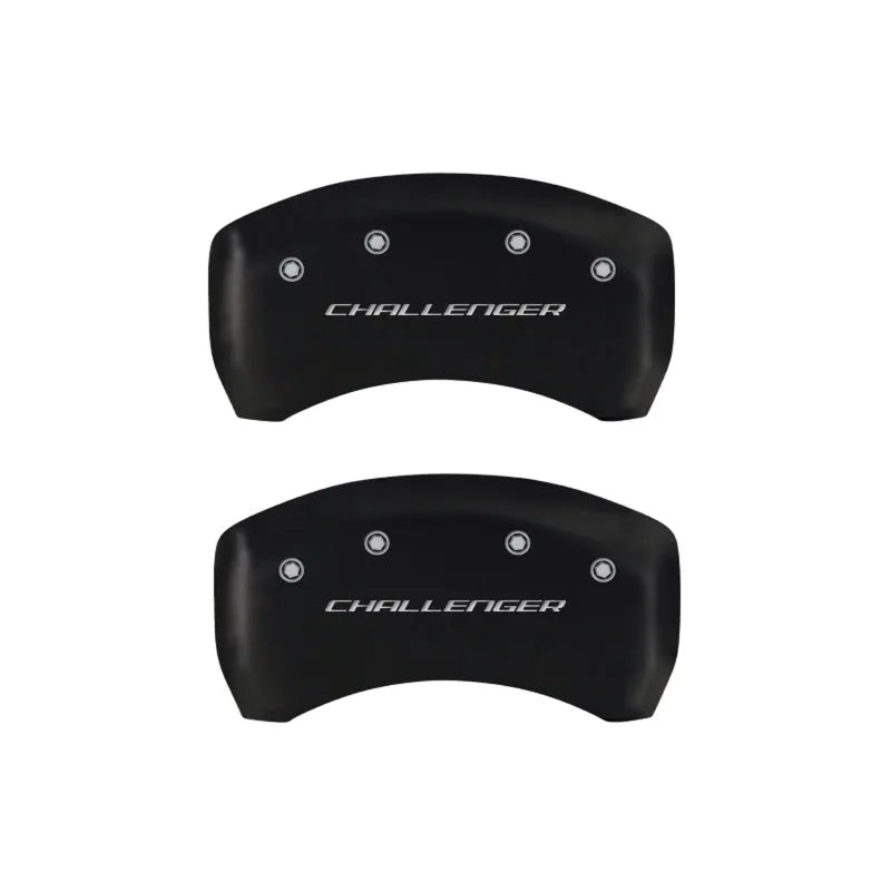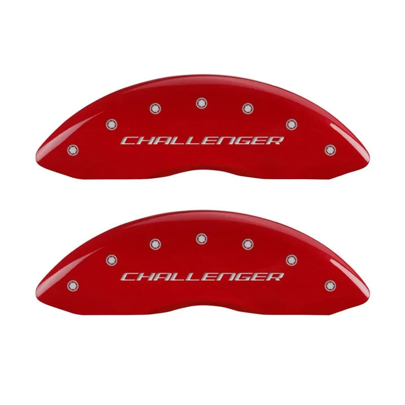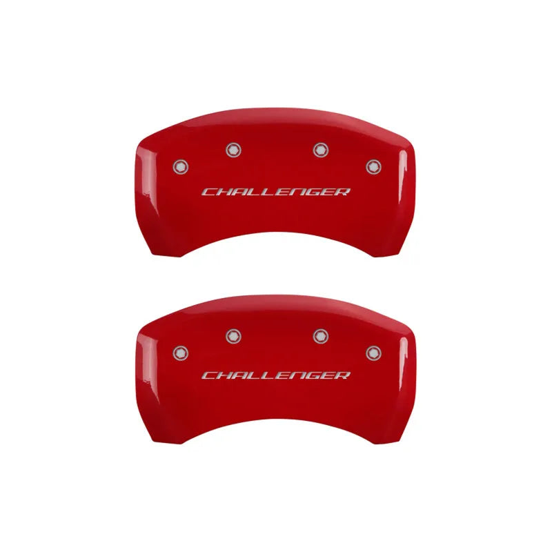 12181SCLBRD MGP 11-23 Dodge Challenger Single Piston Caliper Covers Block Logo (F&R). MGP Caliper Covers offer a sleek, aggressive upgrade by concealing brake calipers with precision-engineered aerospace-grade aluminum covers. Finished in vibrant red with silver BLOCK/CHALLENGER logos, they enhance curb appeal while reducing brake dust buildup. Designed for easy, secure installation with stainless steel clips, these covers fit perfectly on 2011-2023 Dodge Challenger 3.6L V6 and 5.7L HEMI models, providing durable protection and a bold, customized look without costly brake upgrades.