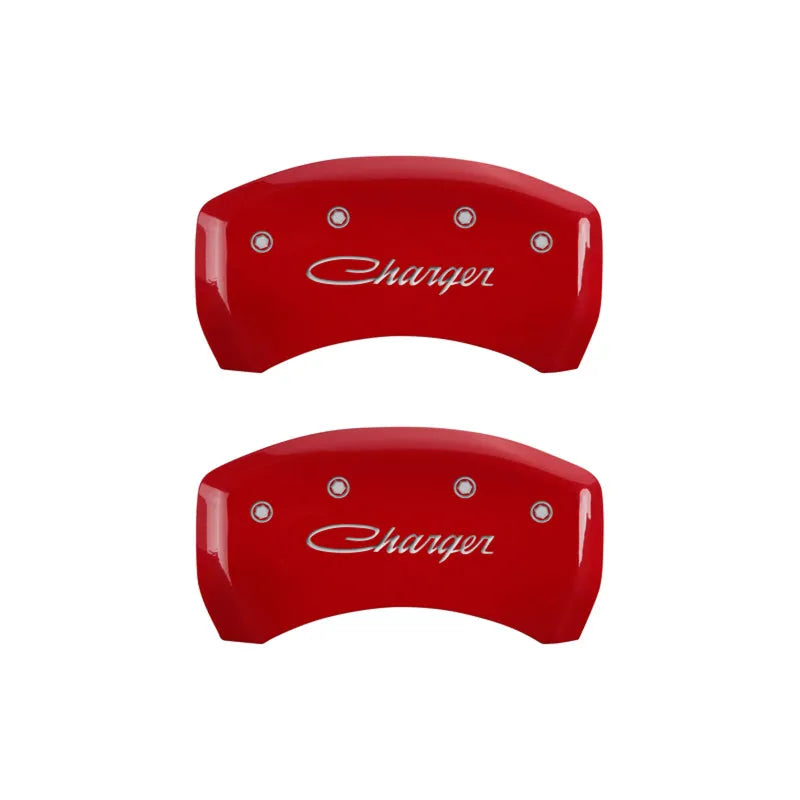 12162SCHSRD MGP 11-23 Dodge Challenger / Charger Dual Piston Caliper Covers. Upgrade your Dodge Challenger or Charger with these precision-engineered caliper covers featuring a vibrant red powder coat and silver cursive "Charger" logos. Crafted from aerospace-grade aluminum, they offer lightweight strength and corrosion resistance while reducing brake dust buildup for cleaner wheels. Designed for easy installation with stainless steel clips, these covers provide a sleek, custom look that enhances curb appeal without modifying your braking system. Perfect for enthusiasts seeking a stylish, durable upgrade for front and rear wheels.
