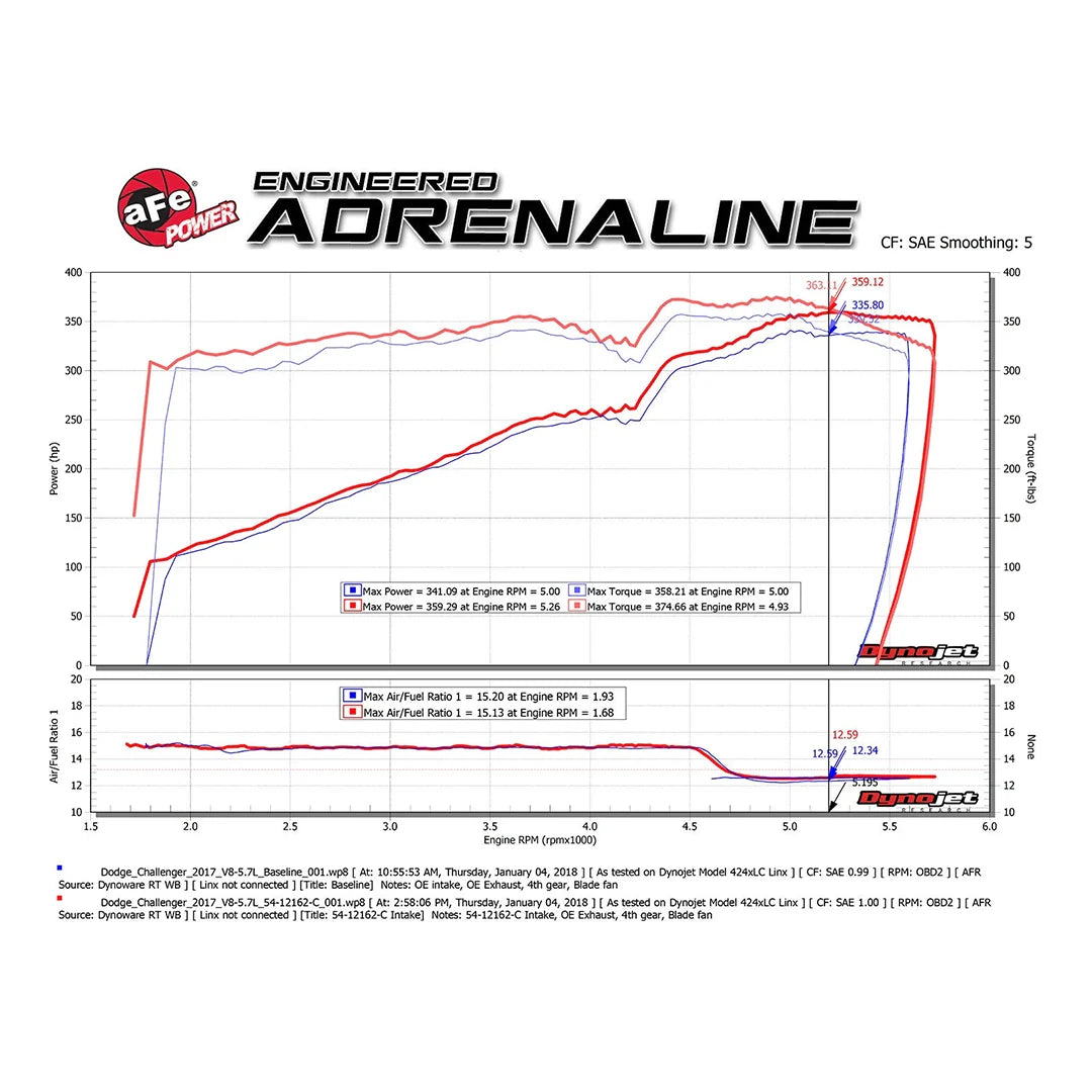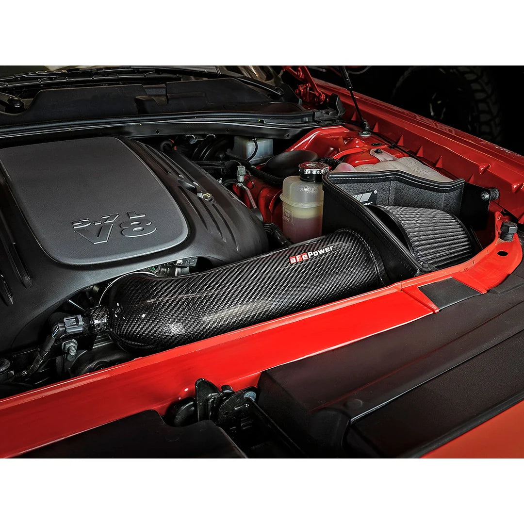 51-12162-C / 54-12162-C AFE Power 11-24 Chrysler 300 / Dodge Challenger / Charger 5.7L Hemi Cold Air Intake (Stage 2, Carbon Fiber). Enhance your engine’s performance and style with this high-performance intake system, featuring a massive 6" flange air filter and a dyno-tuned carbon fiber intake tube. Choose from Pro 5R (oiled) or Pro DRY S (non-oiled) media for optimal airflow and filtration. Includes aluminum heat shield and installs easily with no cutting or drilling.