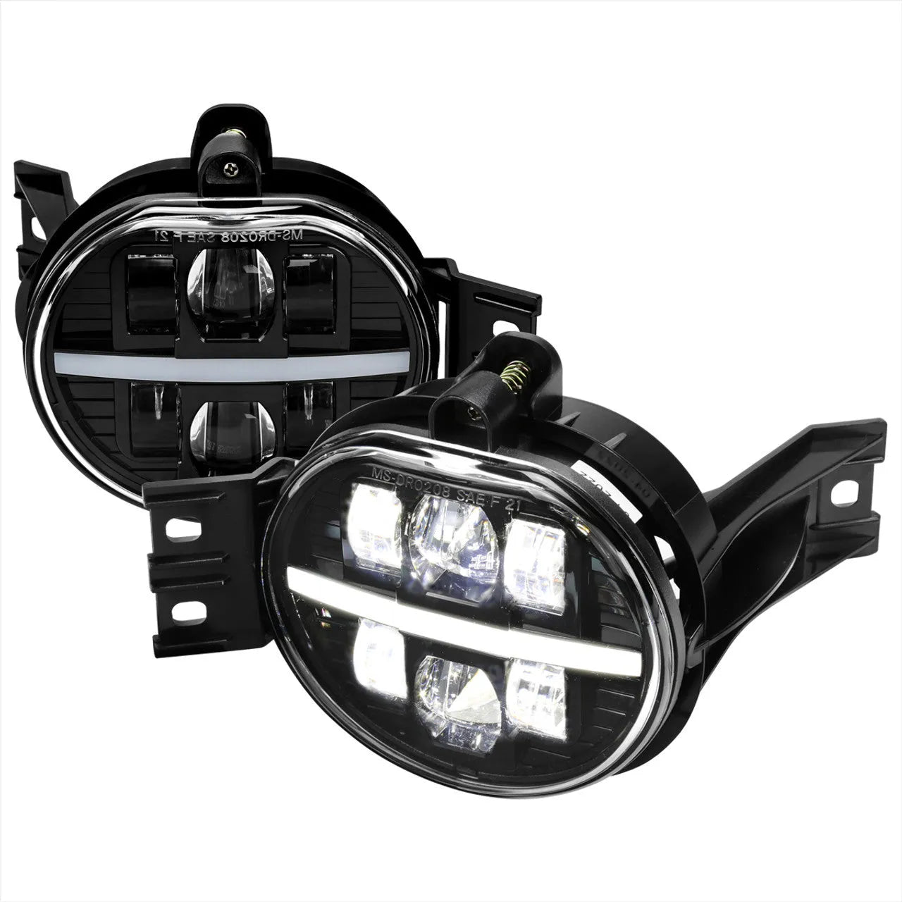 LF-RAM02CLED-MS Spec D 02-10 Dodge Ram / 04-09 Dodge Durango LED Fog Lights. Upgrade your vehicle’s lighting with these high-performance LED fog lights featuring a glossy black housing and clear lens. Equipped with a fiber optic LED bar and 22W SMD bulbs, they deliver 1049 lumens at a crisp 6500K color temperature for superior visibility in fog, rain, and snow. Includes mounting brackets and hardware for easy installation. Manufactured to strict OEM standards by an ISO certified company, these fog lights enhance safety and style on the road. Professional installation recommended.