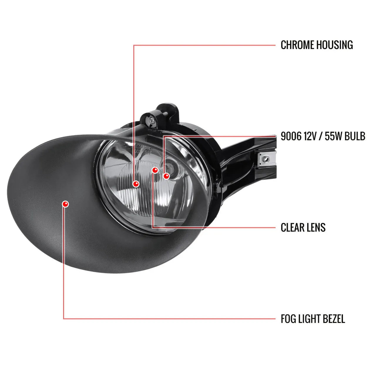 - Chrome housing with clear lens for a clean, factory-style look