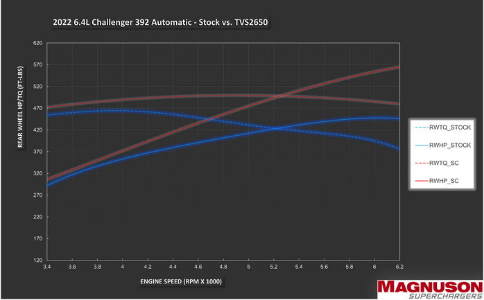 • 524 hp and 529 ft-lbs at 7 lbs of boost on 5.7L Engines• 613 hp and 543 ft-lbs at 5.5 lbs of boost on 6.4L Engines