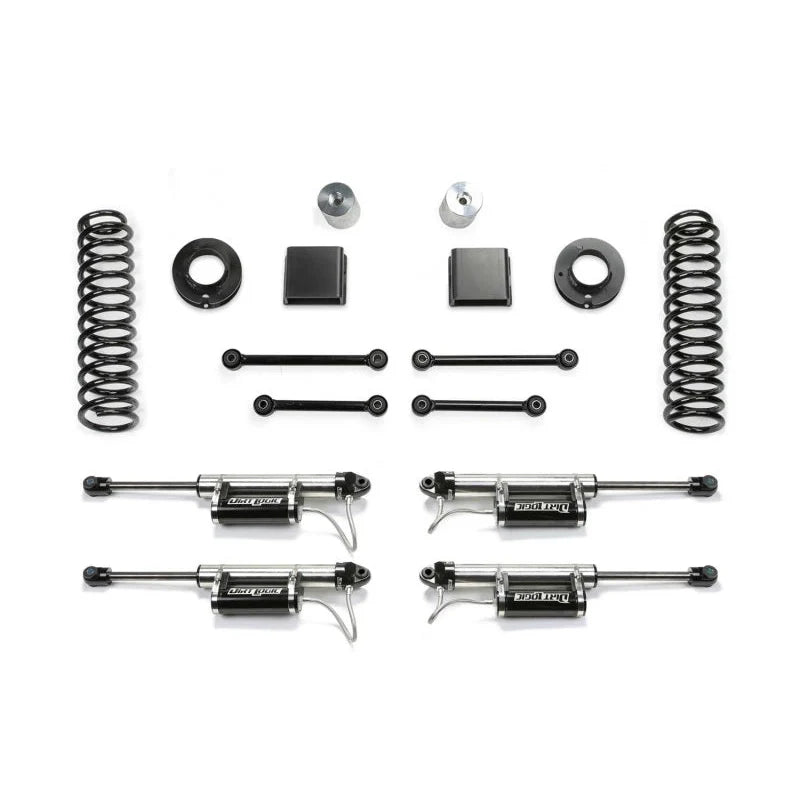 K4161DL Fabtech Jeep Gladiator 2020 3in Sport System w/ DL Resi. The Fabtech 3-inch Sport System with Dirt Logic Reservoir shocks enhances suspension performance and ride height for improved off-road capability and highway comfort. Designed specifically for 2020 Jeep Gladiator 6-cylinder models, it features dual-rate front coil springs for extended travel and coil spacers in the rear to maintain load capacity. This kit also includes upgraded sway bar links and bump stop extensions to optimize suspension articulation and durability. Ideal for Jeep enthusiasts seeking a balanced lift for larger tires and rugged terrain.