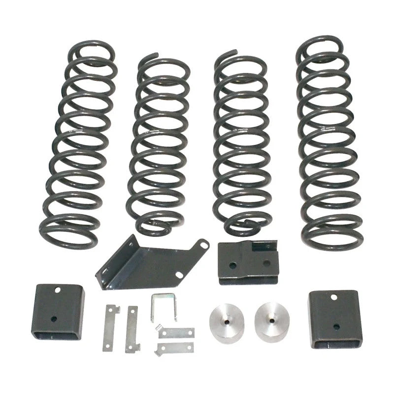 889730 Maxtrac 07-18 Jeep Wrangler / 05-10 Jeep Grand Cherokee 3in Coil Lift Kit w/o Shocks. This suspension lift kit provides a 3-inch lift with front and rear coils, rear track bar, relocation bracket, and front sway bar drop brackets for improved off-road capability and ride quality. Includes bump stop and brake line extensions, requiring little to no fender modifications. Designed for a wide range of Jeep Wrangler models, it enhances ground clearance and suspension travel while maintaining factory-like handling and comfort. Perfect for enthusiasts seeking a reliable lift without shocks.