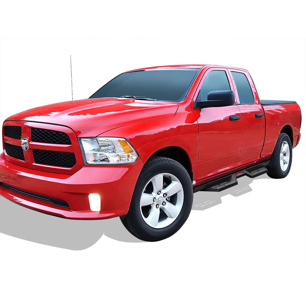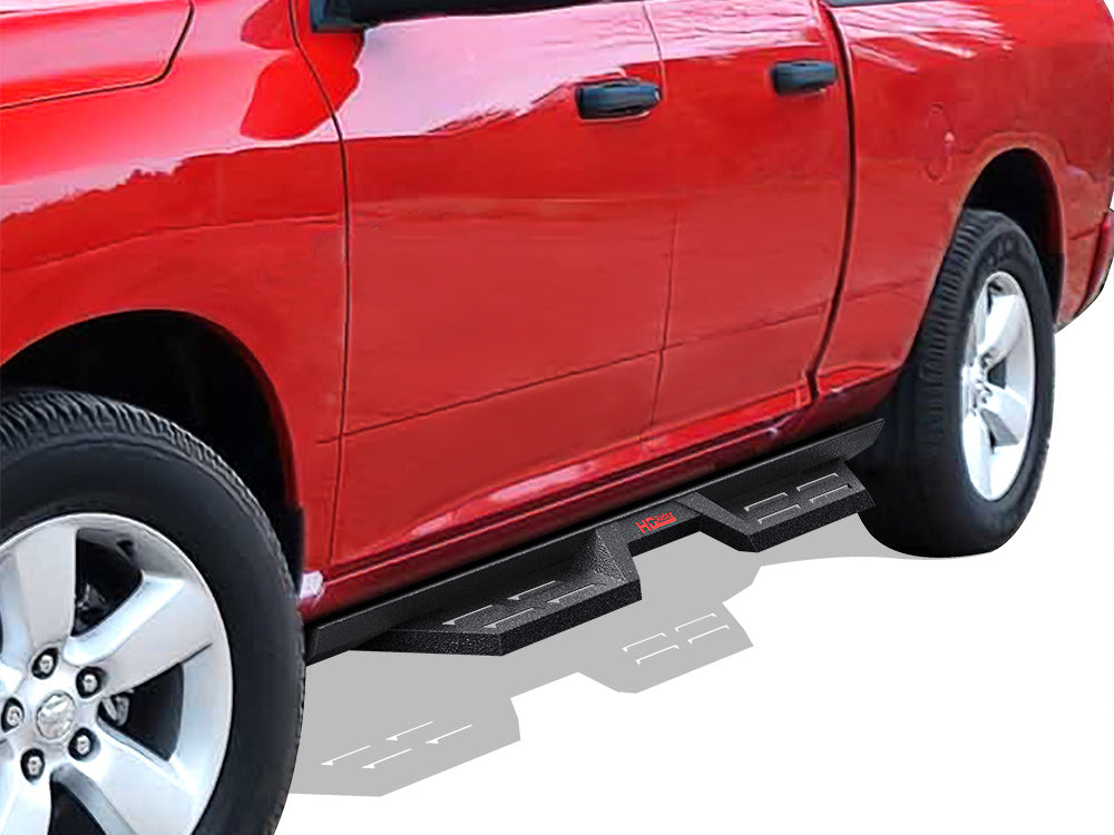 WB04DAG9B APS 09-18 Dodge Ram 1500 Side Armor DS Nerf Bars (Pair) Quad Cab. The unique drop-down style nerf bar has an open wide step area design (length: 16 inches; width: 7). The tread and slots on the step pad provide extra grip for your shoes as you get in and out of the vehicle; and the slots allow water to drain away from the step pad; preventing slipping on wet surfaces.
