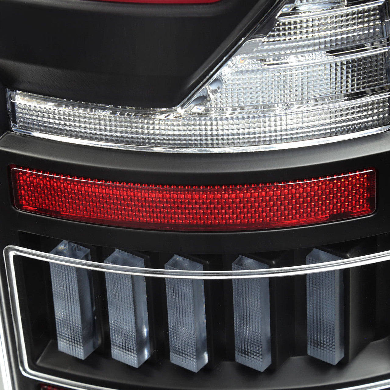 LT-RAM07JRLED-G2-RS Spec D 07-09 Dodge Ram LED Bar Tail Lights (Matte Black / Red LED). Comes with (1) set of LED turn signal tail lights in matte black housing with clear lens. Fiber optic, dynamic LED strip/bar & brake lights.