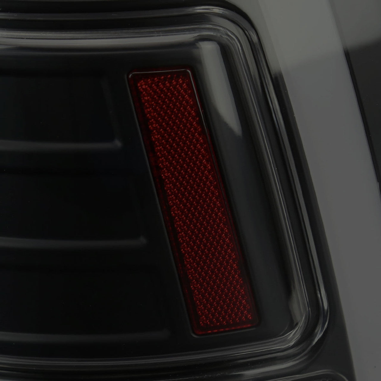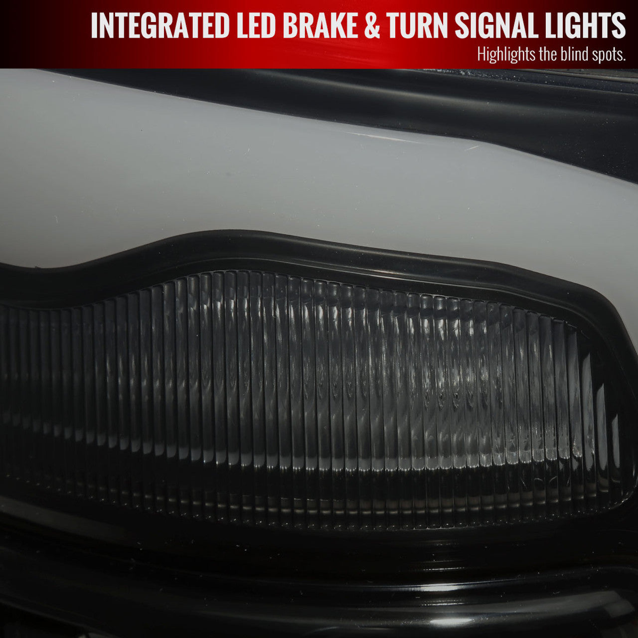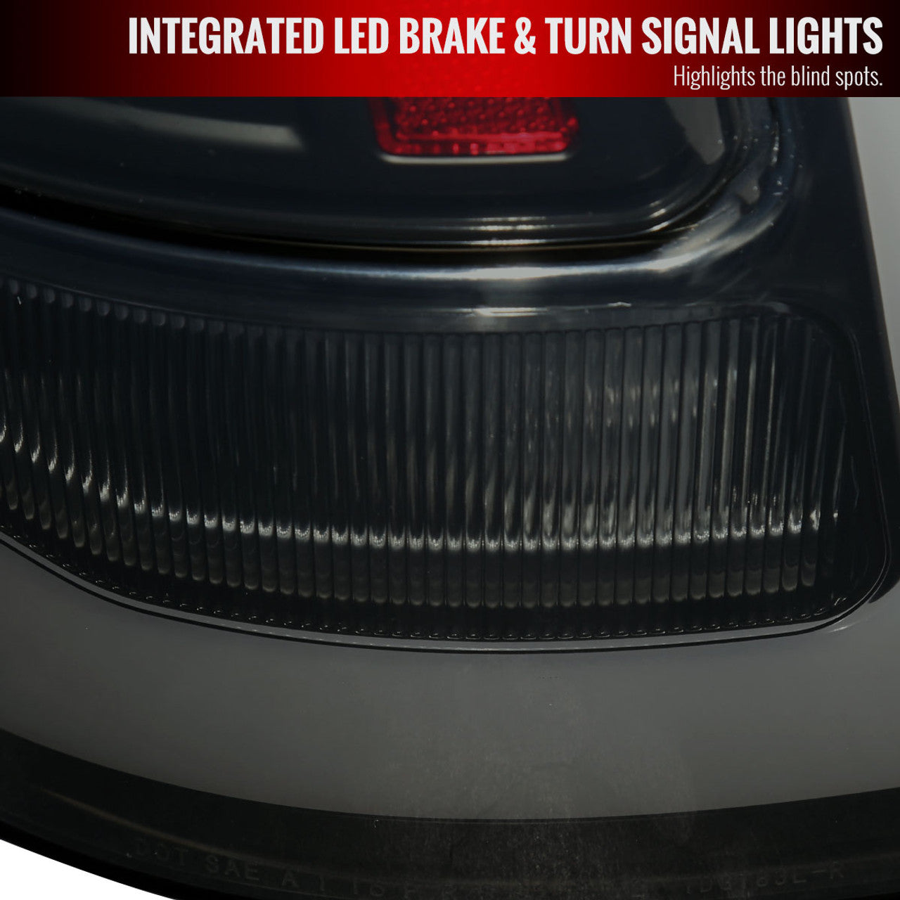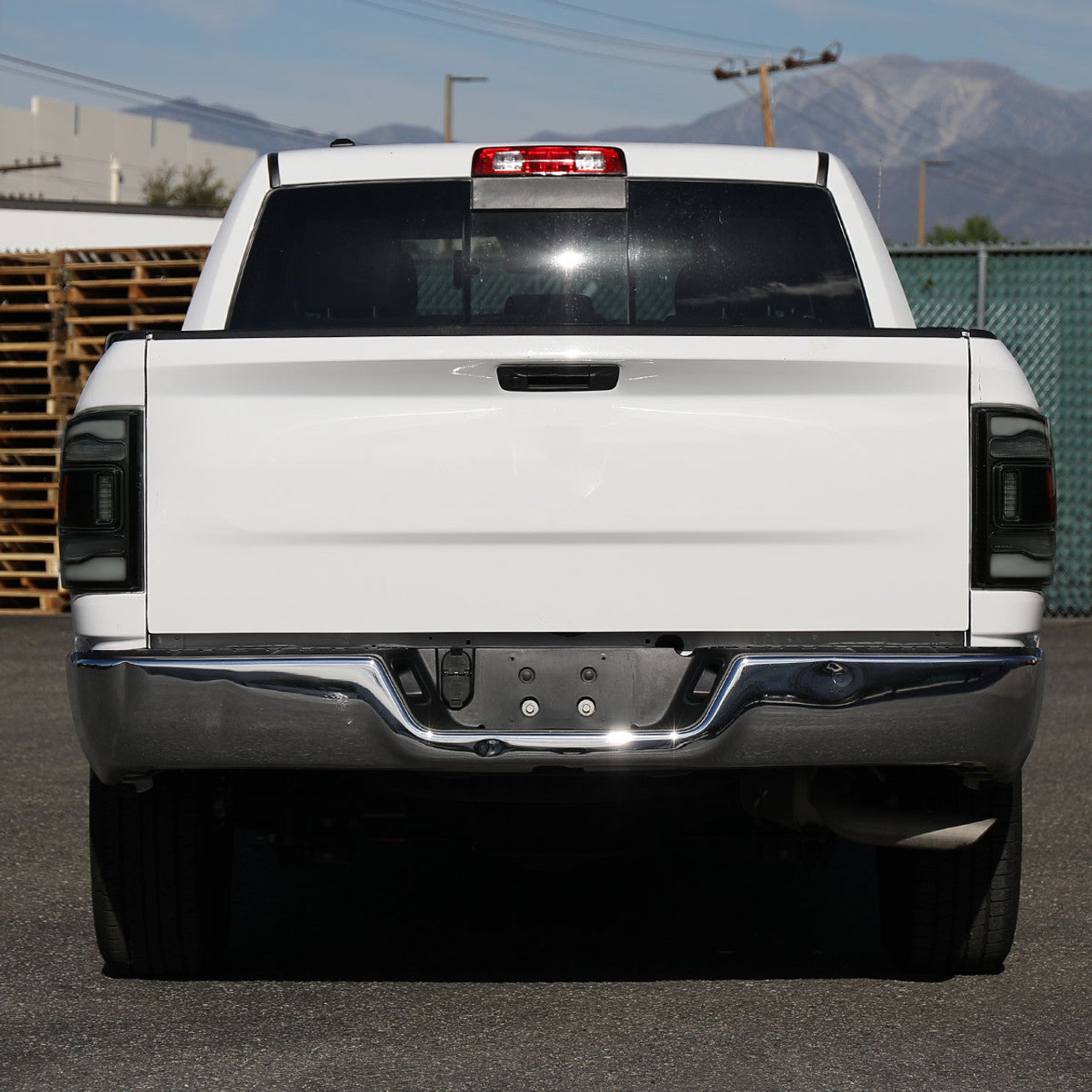 LT-RAM09BBLED-RS Spec D 09-18 Dodge Ram LED Tail Lights (Dark Smoke). Comes with (1) pair of fiber optic white LED tail lights in a black housing with smoke lens.