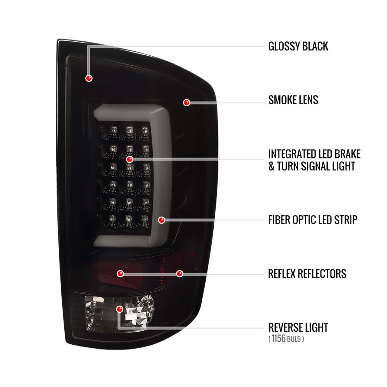 LT-RAM07BBLED-G2-TM Spec D 07-09 Dodge Ram LED Tail Lights (Dark Smoke, G2). Come with 1 pair of driver and passenger side tail lights. Glossy black housing, smoke lens LED tail lights with white LED bar.