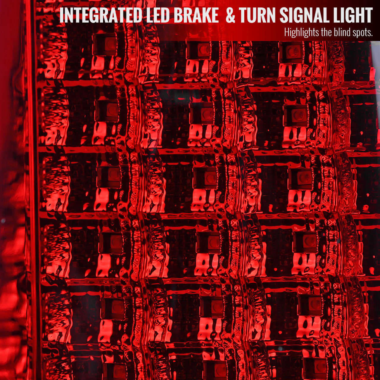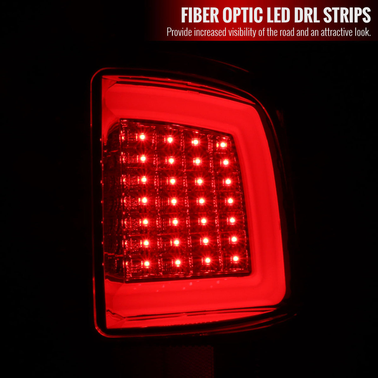 LT-RAM09RLED-G2-TM Spec D 09-18 Dodge Ram LED Tail Lights (Red w/ White LED Bar). Comes with (1) set of LED turn signal tail light in chrome housing red lens. Fiber optic, dynamic LED strip/bar & brake lights.