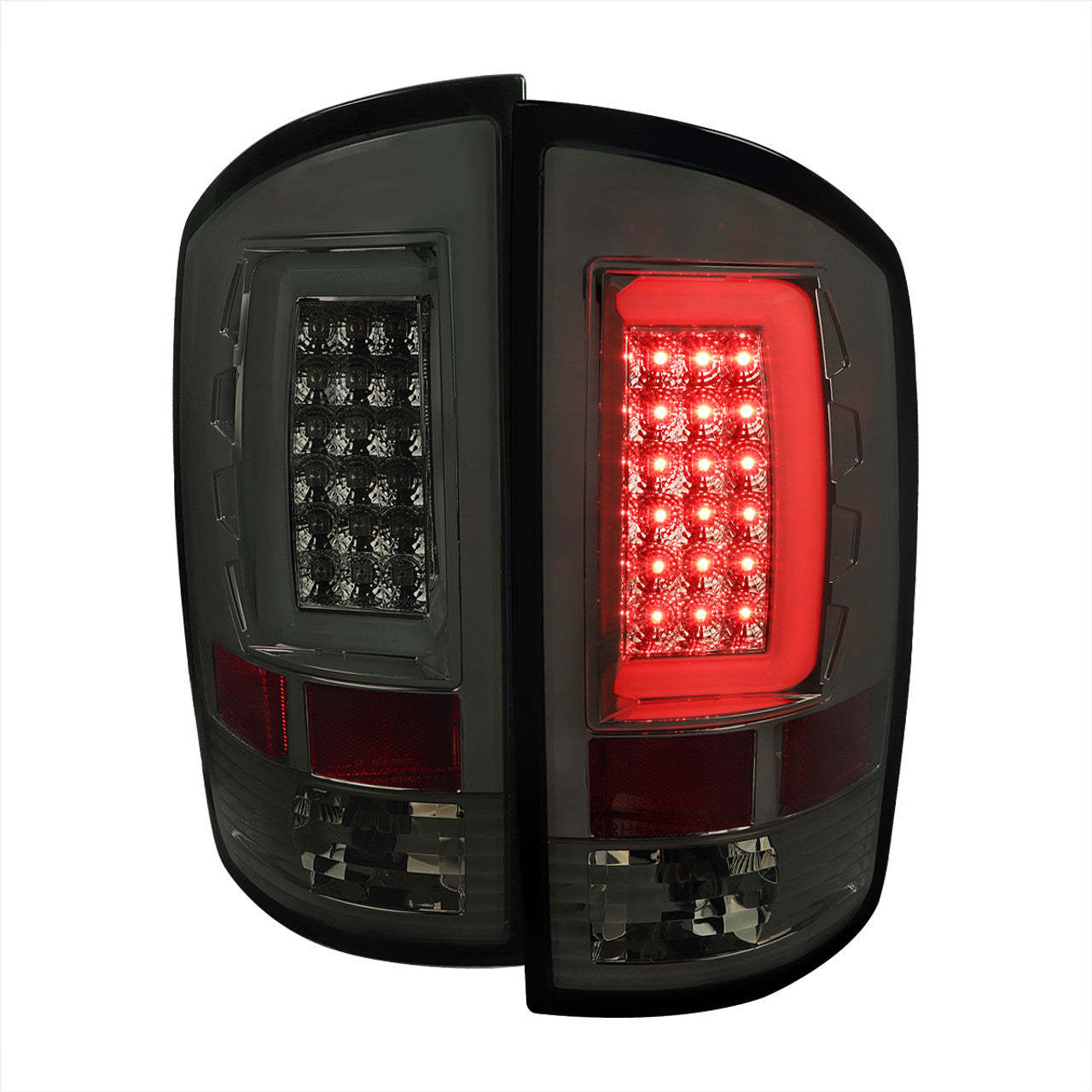 LT-RAM07GLED-G2-TM Spec D 07-09 Dodge Ram LED Tail Lights (Smoke, G2). Come with 1 pair of driver and passenger side tail lights. Chrome housing, smoke lens LED tail lights with white LED bar.