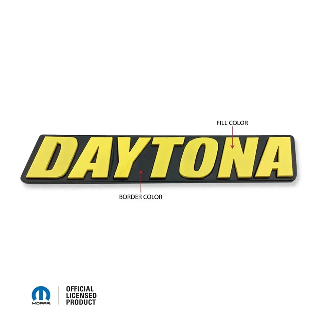 ABD-3232 American Brother Designs 06-23 Dodge Challenger / Charger Front Grille Badge. Professionally color-matched and painted to your choice, this badge installs effortlessly using 3M automotive tape without removing your grille. Made in the USA and officially Mopar licensed, it offers a perfect fit and durable finish. Measuring 5" wide by 15/16" high, it enhances your vehicle's front-end appearance with authentic DAYTONA styling. Upgrade your Dodge with this easy-to-install, high-quality grille badge for a custom, factory-correct look.