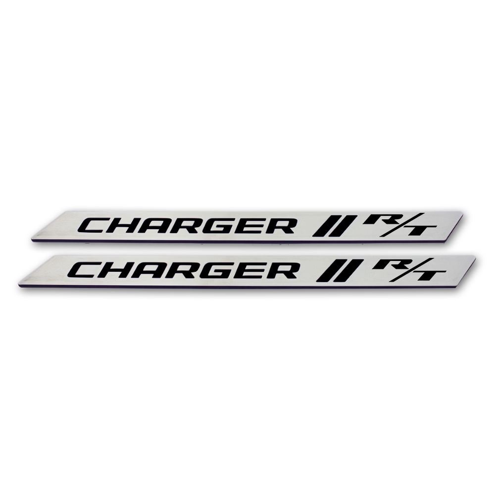 ABD-3202 American Brother Designs 08-23 Dodge Challenger Door Sills. These door sills are meticulously crafted and MOPAR licensed. Your choice of logo. These replacement doorsills are made from premium aluminum billet featuring a brushed finish and accented with durable OEM color-matched paint as rich and lustrous as the paint on your vehicle.
