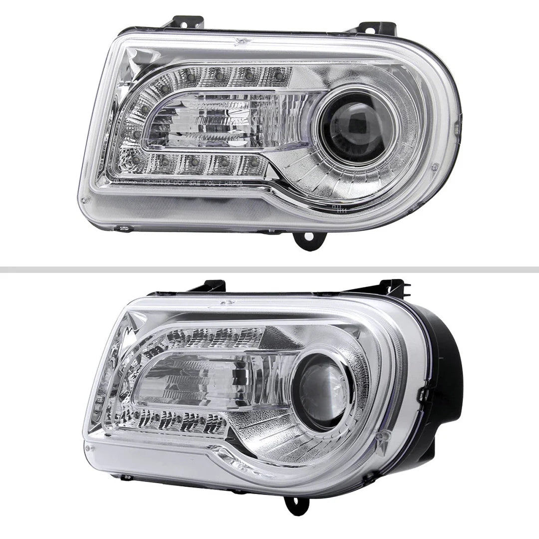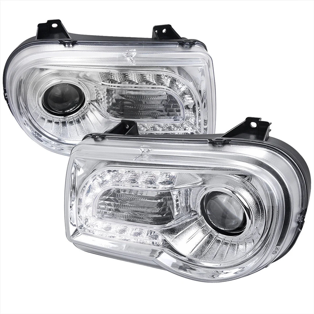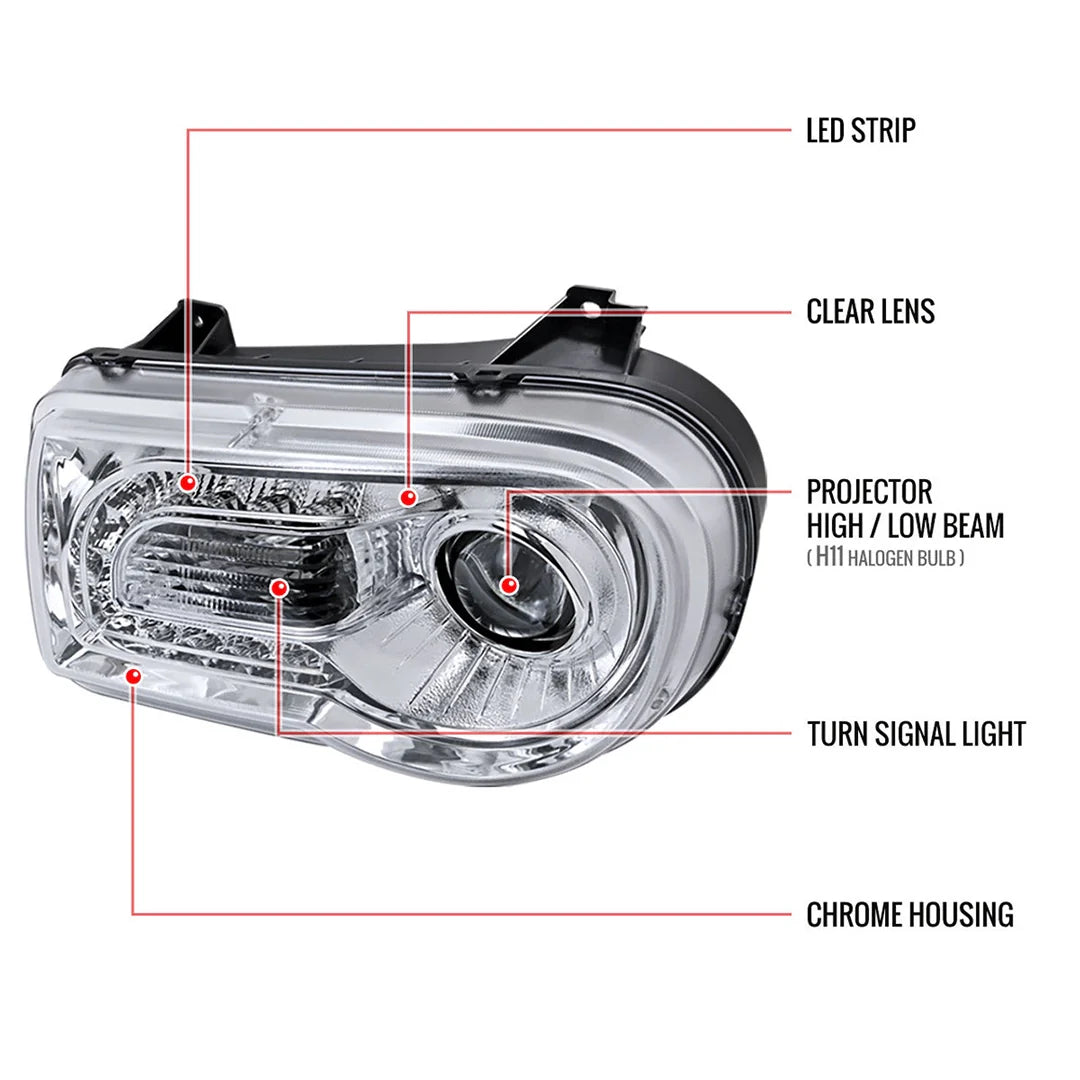 LHP-300C05-TM Spec D 05-10 Chrysler 300C LED Headlights (Chrome). Chrome housing, clear lens projector headlights with LED light strip. Headlights comes equipped with H11 12V/55W high / low beam light bulbs.