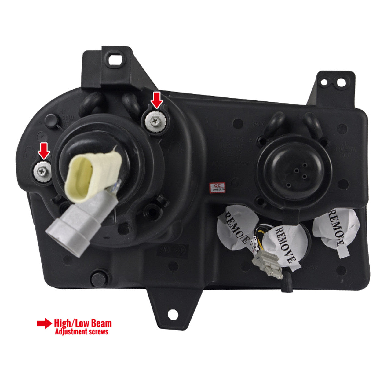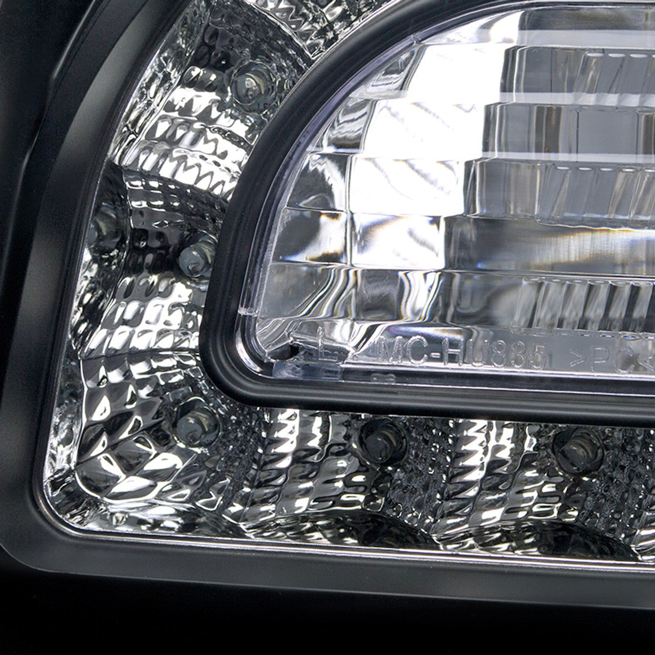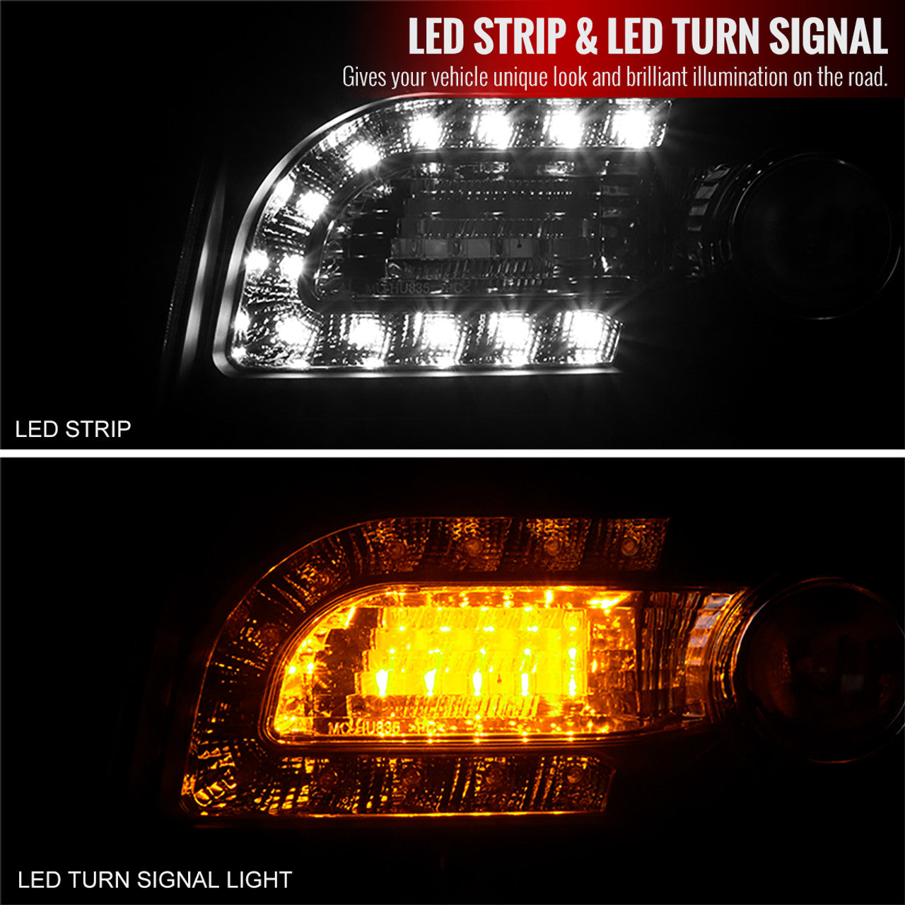 - Matte black housing, clear lens projector headlights with LED light strip & LED turn signal lights