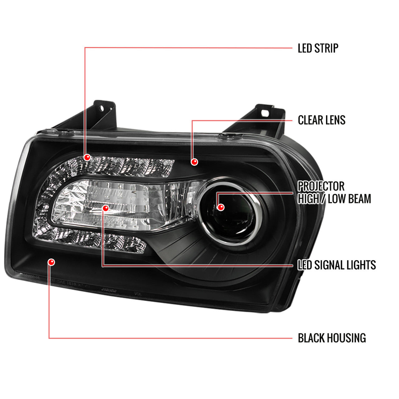 LHP-30005JM-V2-TM Spec D 05-10 Chrysler 300 Projector Halo Headlights (Black, Version 2). Matte black housing, clear lens projector headlights with LED light strip & LED turn signal lights. Equipped with H1 bulbs for high/low beam.