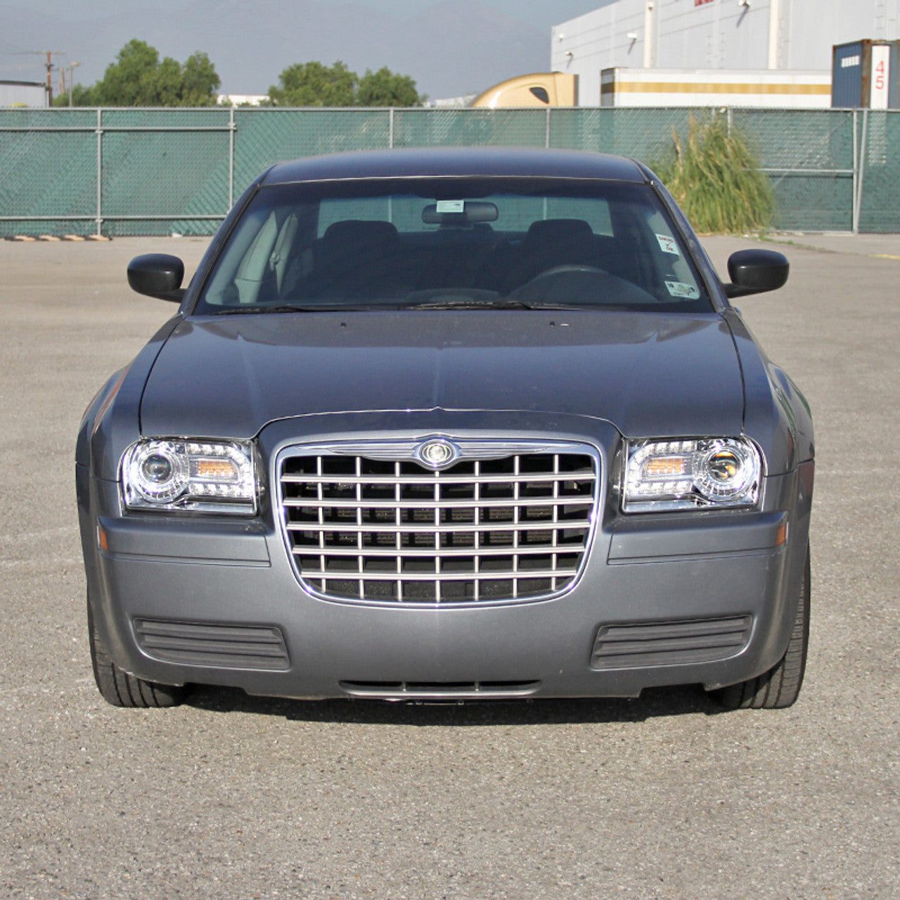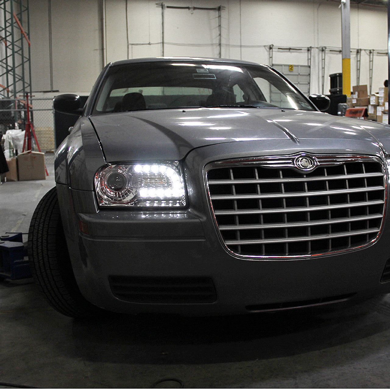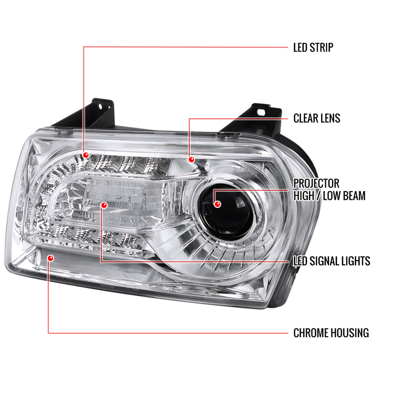 LHP-30005-V2-TM Spec D 05-10 Chrysler 300 Projector Halo Headlights (Chrome, Version 2). Chrome housing, clear lens projector headlights with LED light strip & LED turn signal lights. Equipped with H1 bulbs for high/low beam. Made by an ISO certified manufacturer using materials that meet strict OEM requirements.