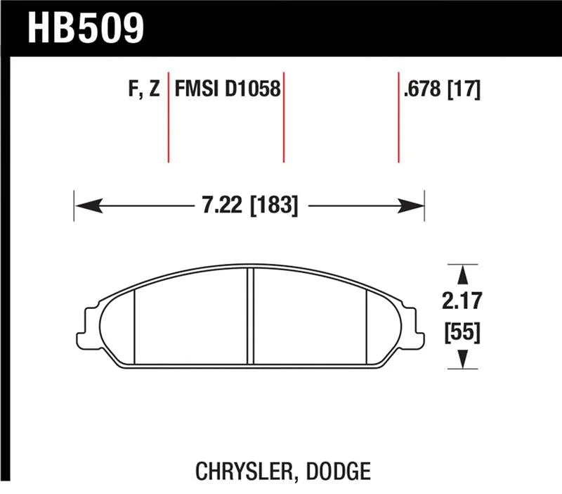 HB509Z.678 Hawk Performance 05-24 Chrysler 300 / Dodge Charger / Challenger / Magnum Front Brake Pads. Hawk Ceramic Front Brake Pads deliver superior stopping power with an ultra-low dust, low-noise ceramic compound. Featuring Performance Ceramic technology, these pads reduce noise, vibration, and harshness while providing a linear friction profile for enhanced ABS responsiveness. Designed for high-performance braking, they minimize rotor wear, maintain consistent pedal feel, and ensure long-lasting durability. Backed by a limited lifetime warranty, these pads offer reliable, smooth braking performance for V6 and 5.7L Hemi models.