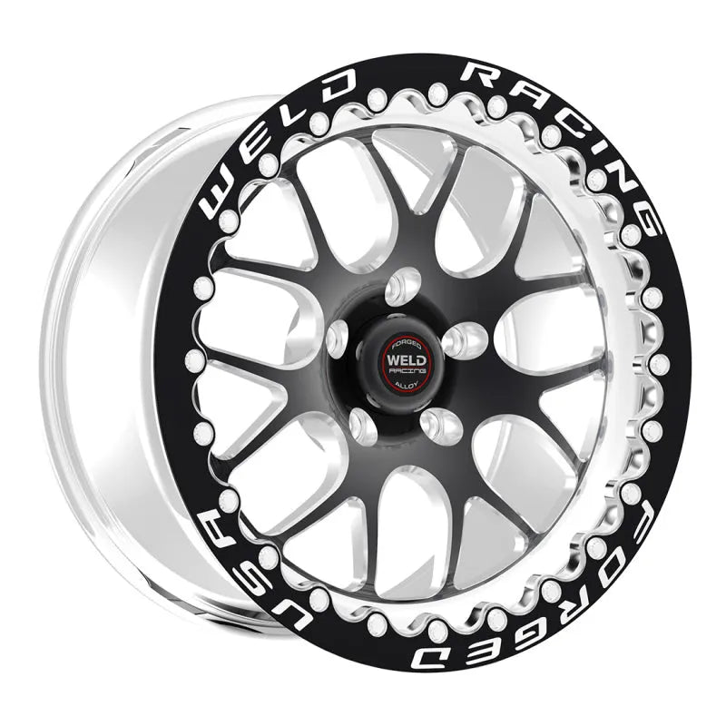 The Weld S77 17x10 wheel is a high-performance, forged aluminum wheel designed for modern muscle cars. Featuring a classic tuning fork design with a 3-piece construction, it combines forged shells and 6061 centers to deliver exceptional strength while minimizing weight. The wheel's black machined finish with polished or black centers enhances its aggressive aesthetic, making it suitable for street performance. Its construction ensures durability and reliability under demanding driving conditions, providing improved handling and visual appeal for muscle car enthusiasts.
