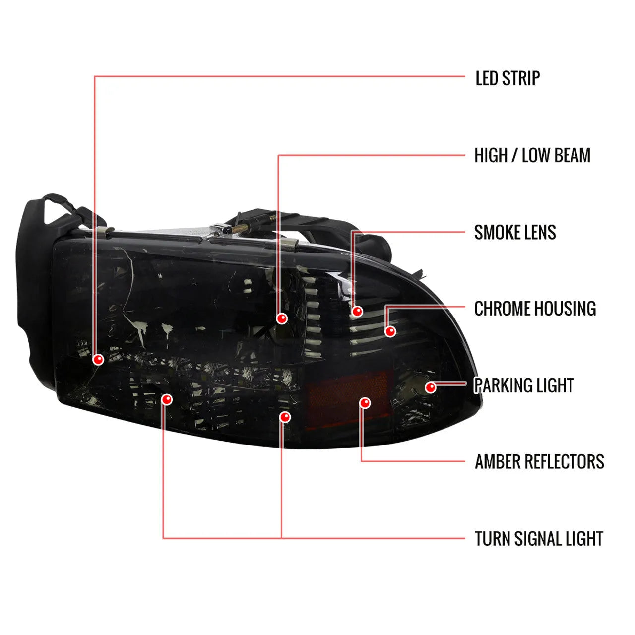 2LH-DAK97G-RS Spec D 97-04 Dodge Dakota / 98-03 Durango Crystal Headlights w/ LED's (Smoke). Upgrade your vehicle's front end with these stylish Spec D Crystal Headlights featuring a chrome housing and smoked lens for a sleek look. Equipped with bright SMD LED light strips for enhanced visibility and modern appeal. Designed to fit 9007 Hi/Low-beam bulbs (not included) and manufactured to meet strict OEM standards. Perfect for those seeking both improved lighting performance and aggressive styling. Professional installation is recommended for optimal results.