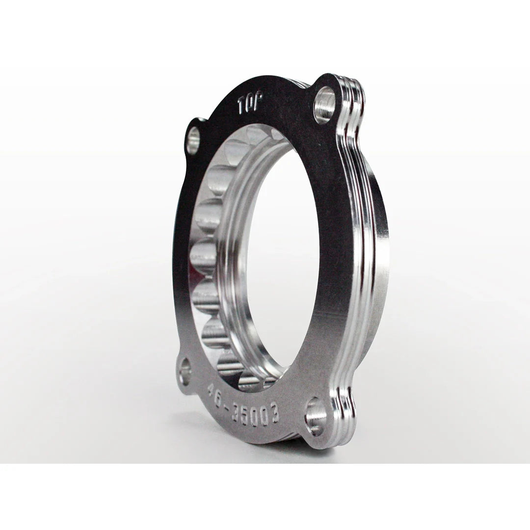 This Silver Bullet throttle body spacer produces 6 hp and 14 lbs. x ft. torque and is constructed from precision machined 6061-T6 billet aluminum and is designed using a serrated/helix design that creates turbulence in the air flow at the point just prior entry into the engine optimizing the combustion cycle. This turbulence helps the air/fuel charge burn completely providing increased horsepower, torque and improved throttle response. This spacer works with the factory and aFe Power cold air intake systems.