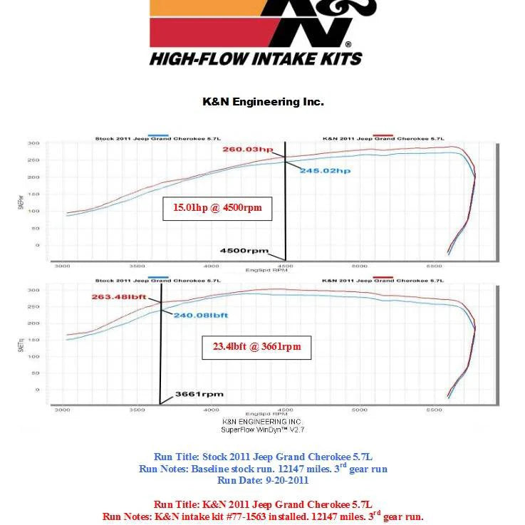 77-1563KP K&N Filters 11-25 Dodge Durango / Jeep Grand Cherokee 5.7L Hemi 77 Series Cold Air Intake. Boost performance with the K&N 77 Series Cold Air Intake, engineered to deliver increased horsepower and torque. Featuring a mandrel-bent aluminum intake tube and a high-flow reusable oiled cotton filter, this system enhances airflow and filtration. Easy to install, durable, and backed by a Lifetime Limited Warranty, it’s built for lasting performance.