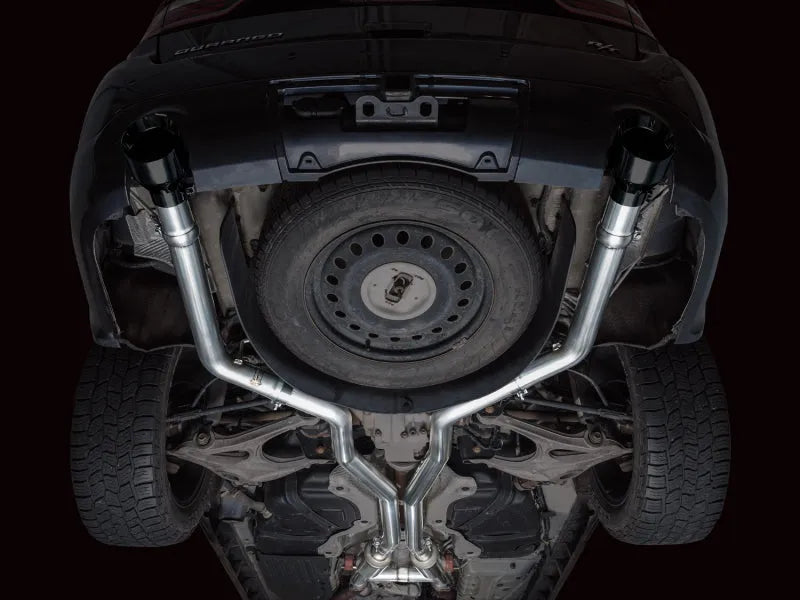 AWE 3020-33575 Track Edition Cat-Back Exhaust (Black Tips) for 11-25 Dodge Durango 5.7L Hemi. For those who crave raw power, the Track Edition delivers with the same precision-engineered H-pipe as the Touring Edition, minus AWE's 180 Technology®—resulting in straight-pipe sections that unleash aggressive, rowdy sound through mid-range acceleration and deceleration; no returns based on sound preference—you've been warned.