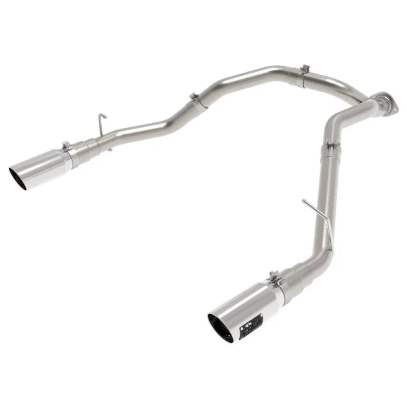 - Dual 5-inch diameter polished 304 stainless steel clamp-on exhaust tips featuring a riveted aFe POWER logo plate for distinctive styling