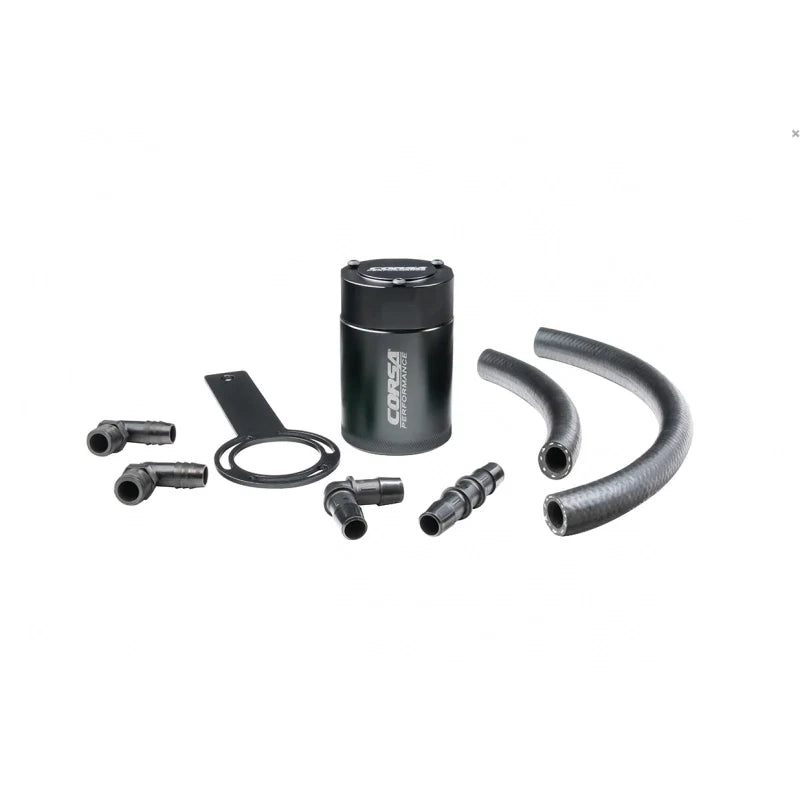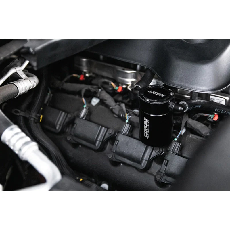 The CORSA Performance Oil Catch Can for the vehicle is engineered to protect your engine from harmful blow-by gases, oil vapors, water, and particulates. These contaminants, if left unchecked, can coat intake valves, reduce airflow, and decrease engine efficiency. By capturing them before they re-enter the intake path, CORSA's catch can helps reduce carbon buildup, maintain engine performance, and extend the life of key components.