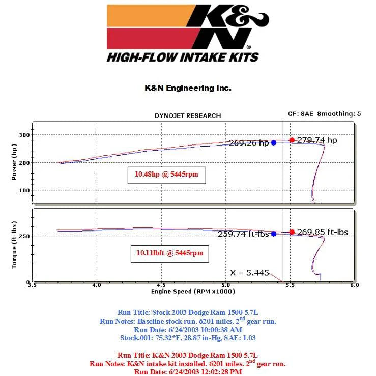 57-1533 K&N Filters 03-08 Dodge Ram 5.7L Hemi 57 Series FIPK Cold Air Intake. The K&N® 57 Series FIPK Cold Air Intake increases horsepower and torque while improving throttle response and engine sound. Featuring a roto-molded HDPE intake tube, oversized washable oiled cotton filter, and heat shield, it delivers high airflow and protection from engine heat. Quick installation and No-Hassle Lifetime Limited Warranty provide reliable performance for your vehicle.