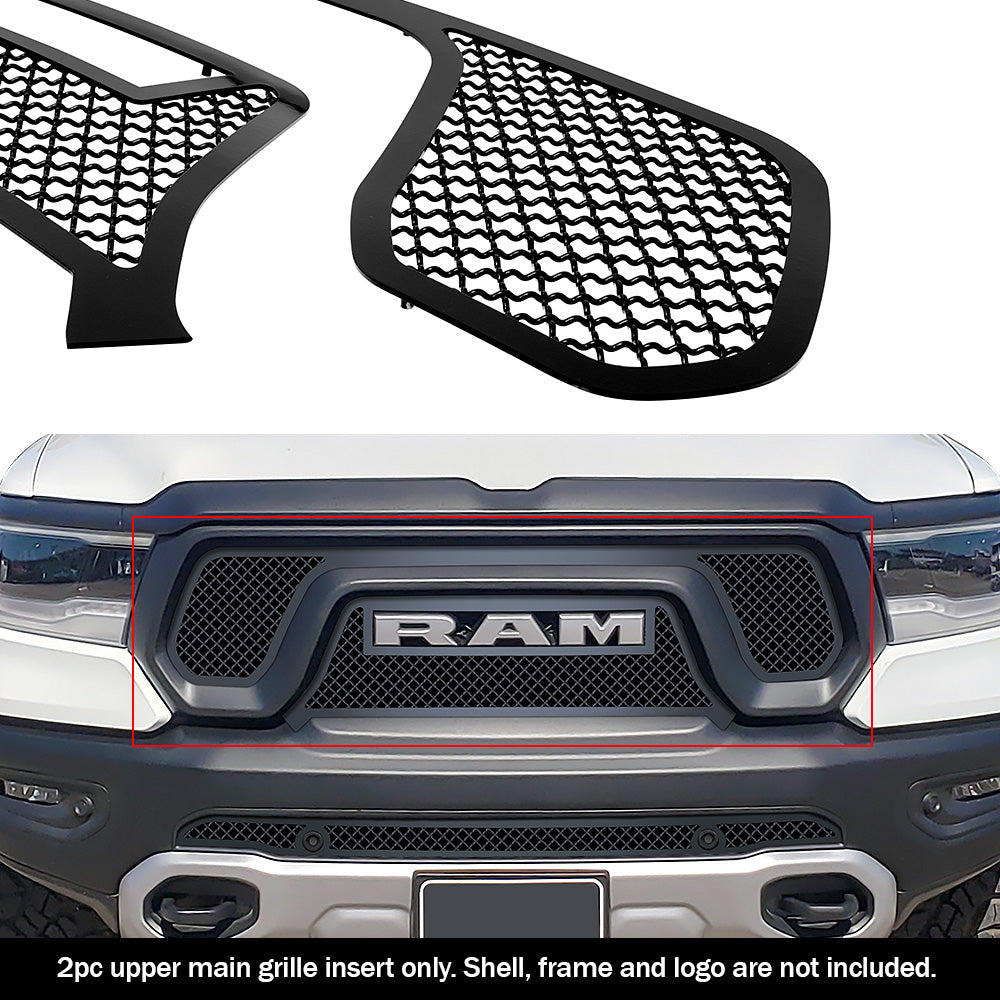 GR04GEB03K APS 19-24 Ram 1500 Black Stainless Upper Mesh Grille. A unique black mesh design that adds a rugged and aggressive look and gives your vehicle an upgraded appearance.