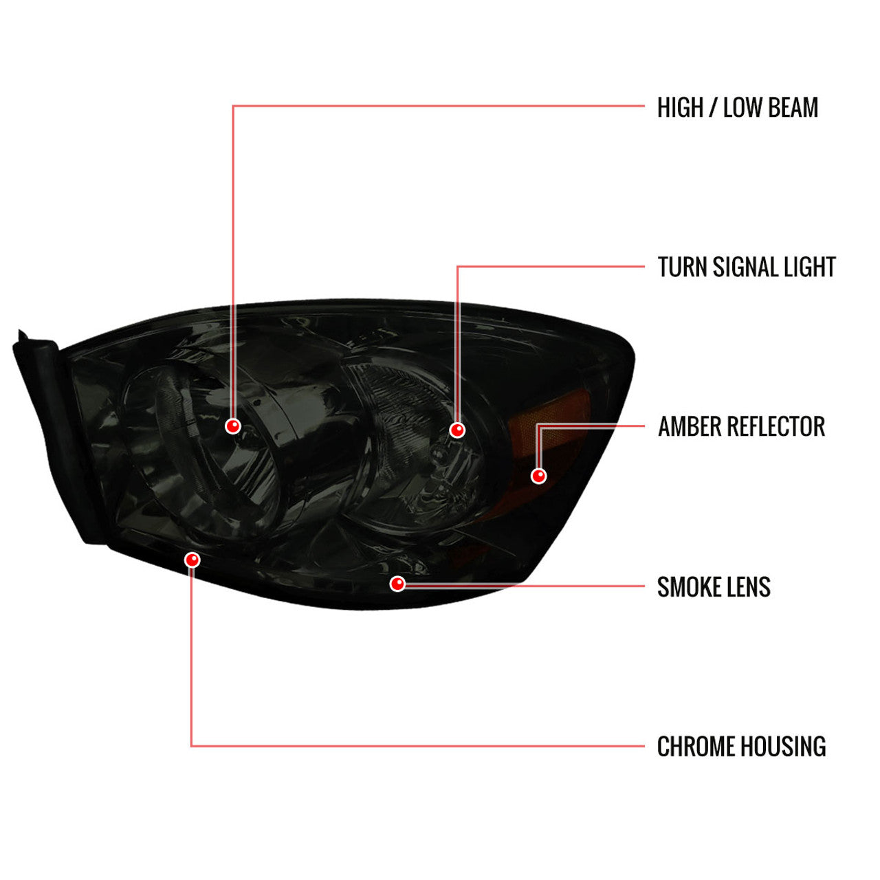 2LH-DGP06G-RS Spec D 06-09 Dodge Ram Euro Headlights (Smoke). Chrome housing, smoke lens with amber reflectors.