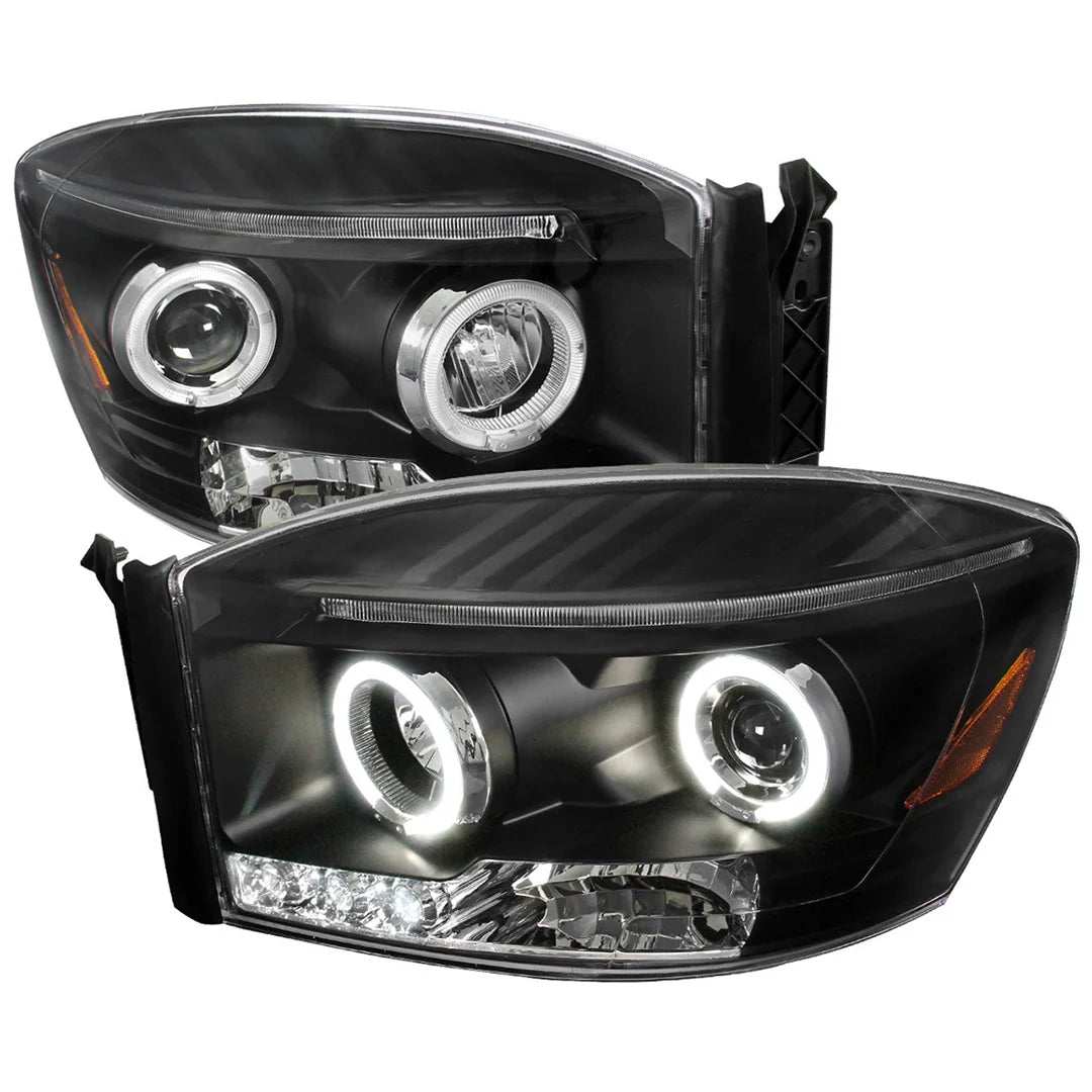 2LHP-RAM06JM-TM Spec D 06-08 Dodge Ram LED Projector Headlights (Black). Matte black housing, clear lens dual halo projector headlights with LED accent lights. Comes equipped with H1 low beam & H1 high beam bulbs.