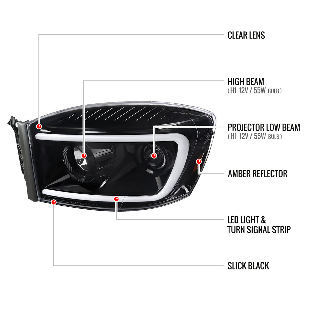 2LHP-RAM06BK-G2-TM Spec D 06-08 Dodge Ram LED Projector Headlights (Glossy Black). Comes with 1 pair of driver and passenger side headlights. Jet black housing, clear lens headlights with LED C-Bar/ signal strip.