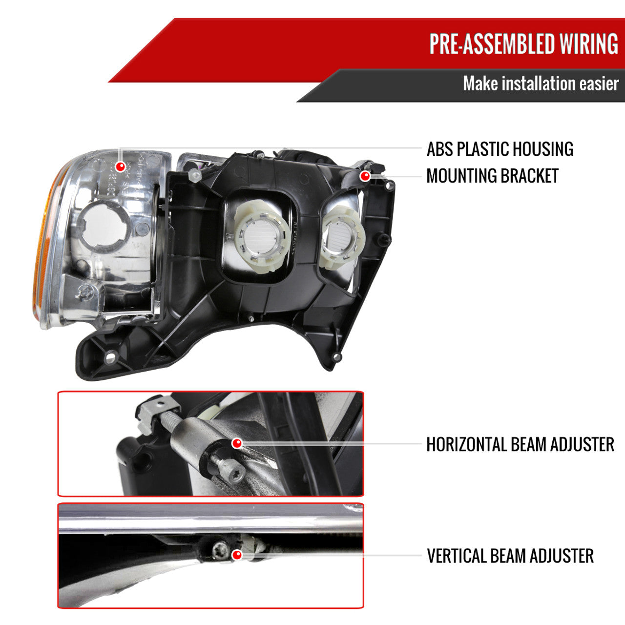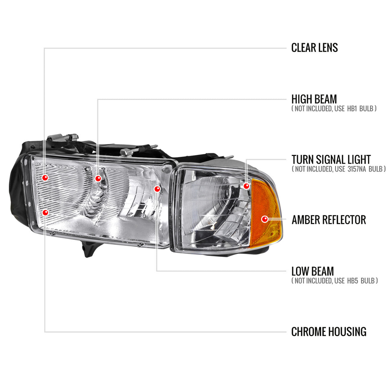- Comes with (1) pair of chrome housing factory style headlights and corner lights with clear lens and amber reflector