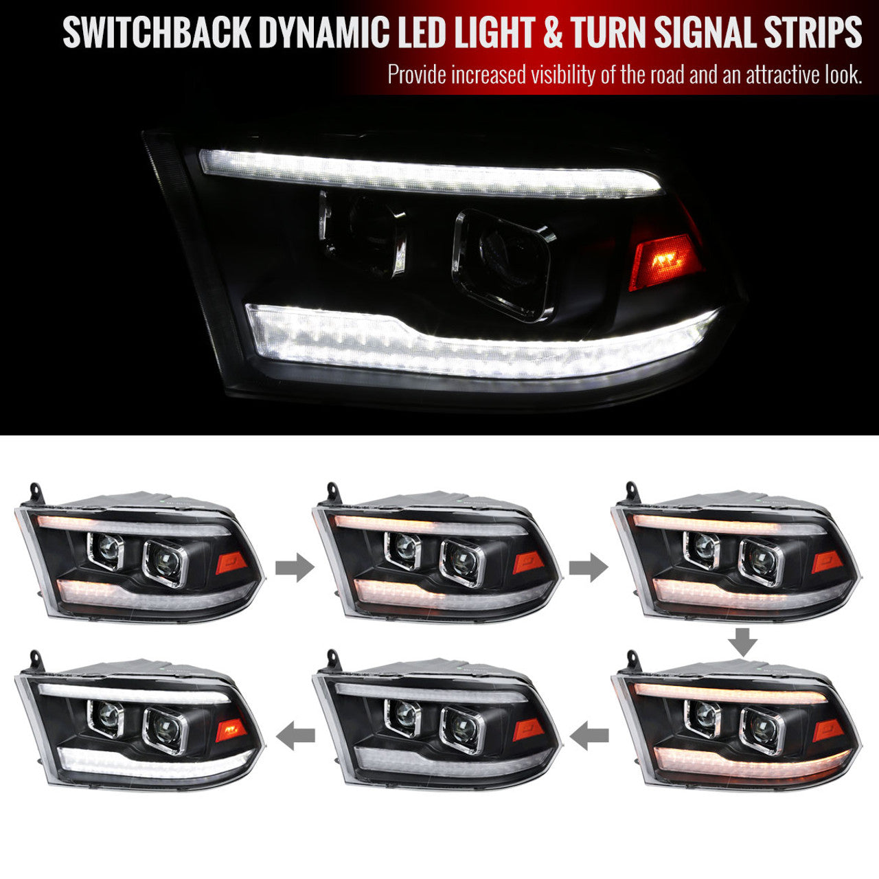2LHP-RAM09JMG7-SQ-RS Spec D 09-18 Dodge Ram Projector Halo Headlights (Black w/ LED Sequential Signal). Comes with (1) pair of projector headlights only. Matte black housing, clear lens projector headlights with switchback sequential turn signal lights.