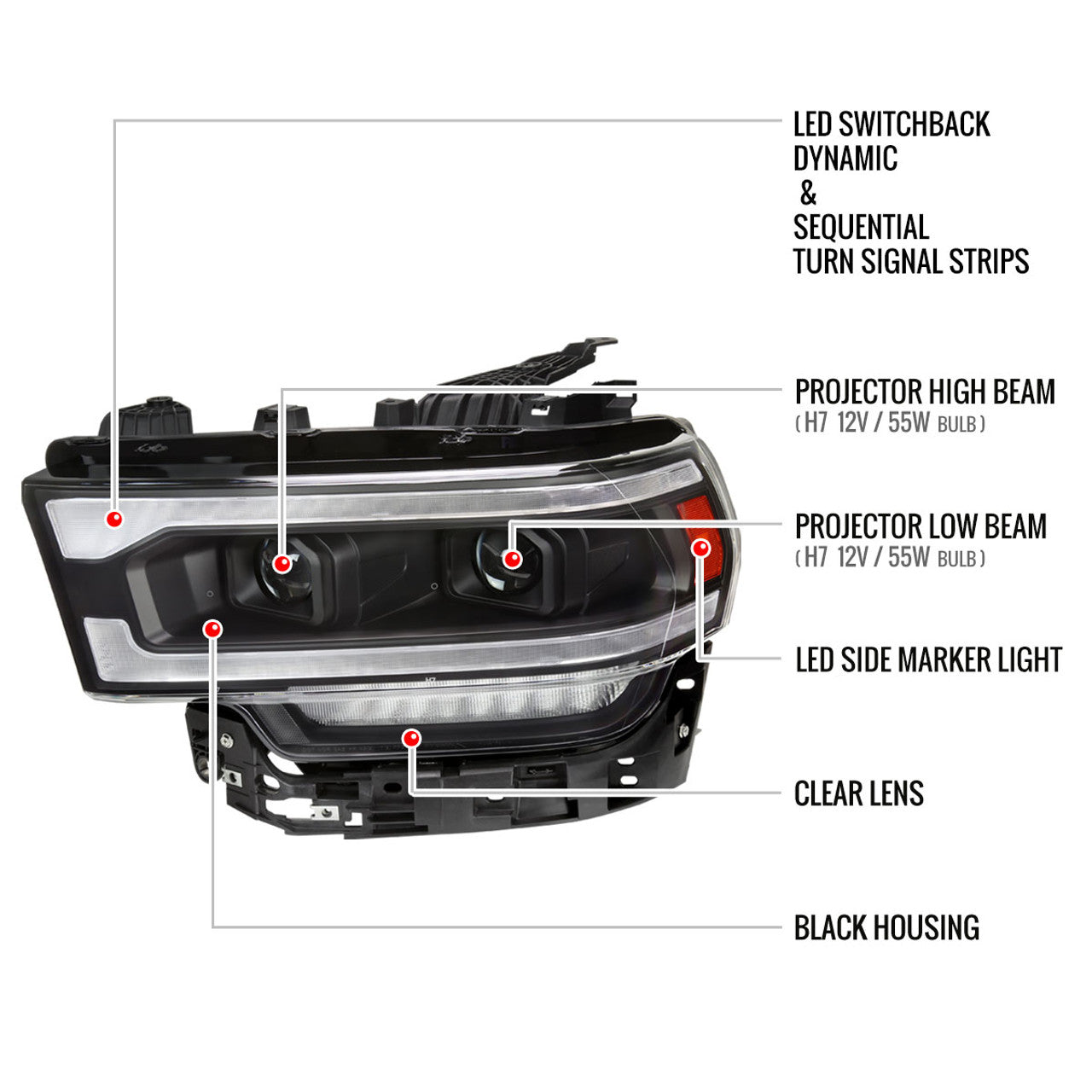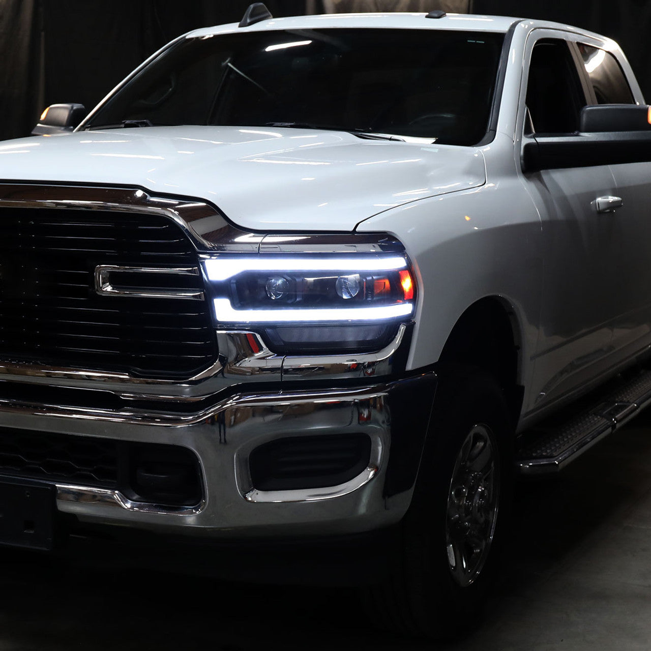 2LHP-RAM1925JM-SQ-RS Spec D 19-24 Ram 2500 & 3500 Projector Halo Headlights (Black w/ Sequential LED Signal). Includes (1) pair of dual projector style headlights with switchback, sequential LED turn signal in matte black housing with clear lens. Fiber Optic LED strip with start up animation (Activated when parking light is on).