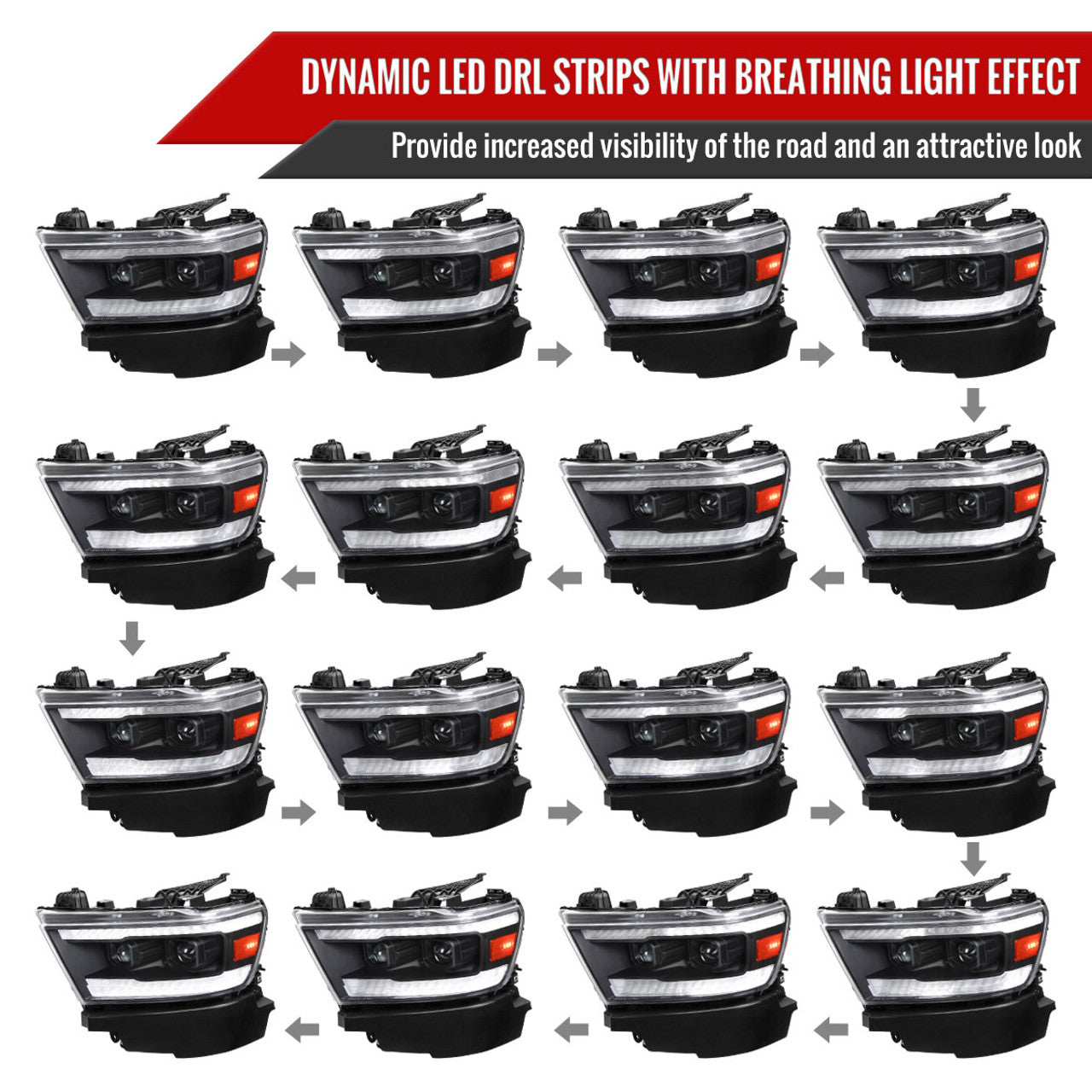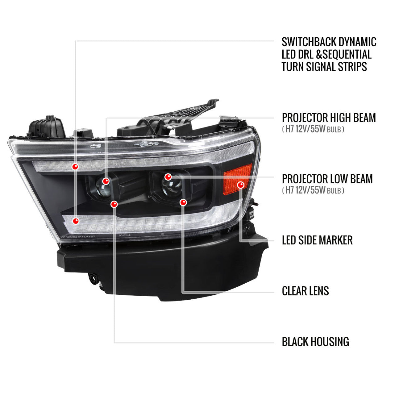 2LHP-RAM1915JM-SQ-RS Spec D 19-24 Ram 1500 Projector Halo Headlights (Black w/ Sequential Turn Signal). Includes (1) pair of projector style headlights with switchback, sequential LED turn signal in matte black housing with clear lens. Fiber Optic LED strip with start up animation (Activated when parking light is on).