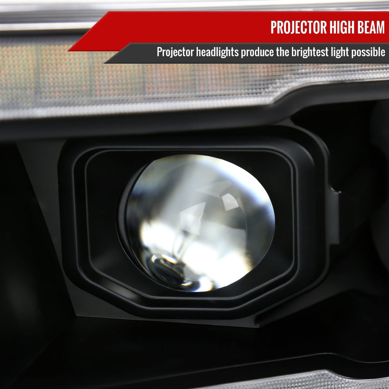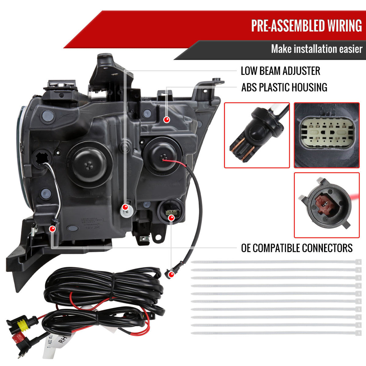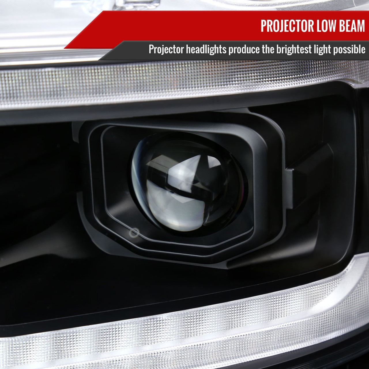 - Includes (1) pair of projector style headlights with switchback, sequential LED turn signal in matte black housing with clear lens