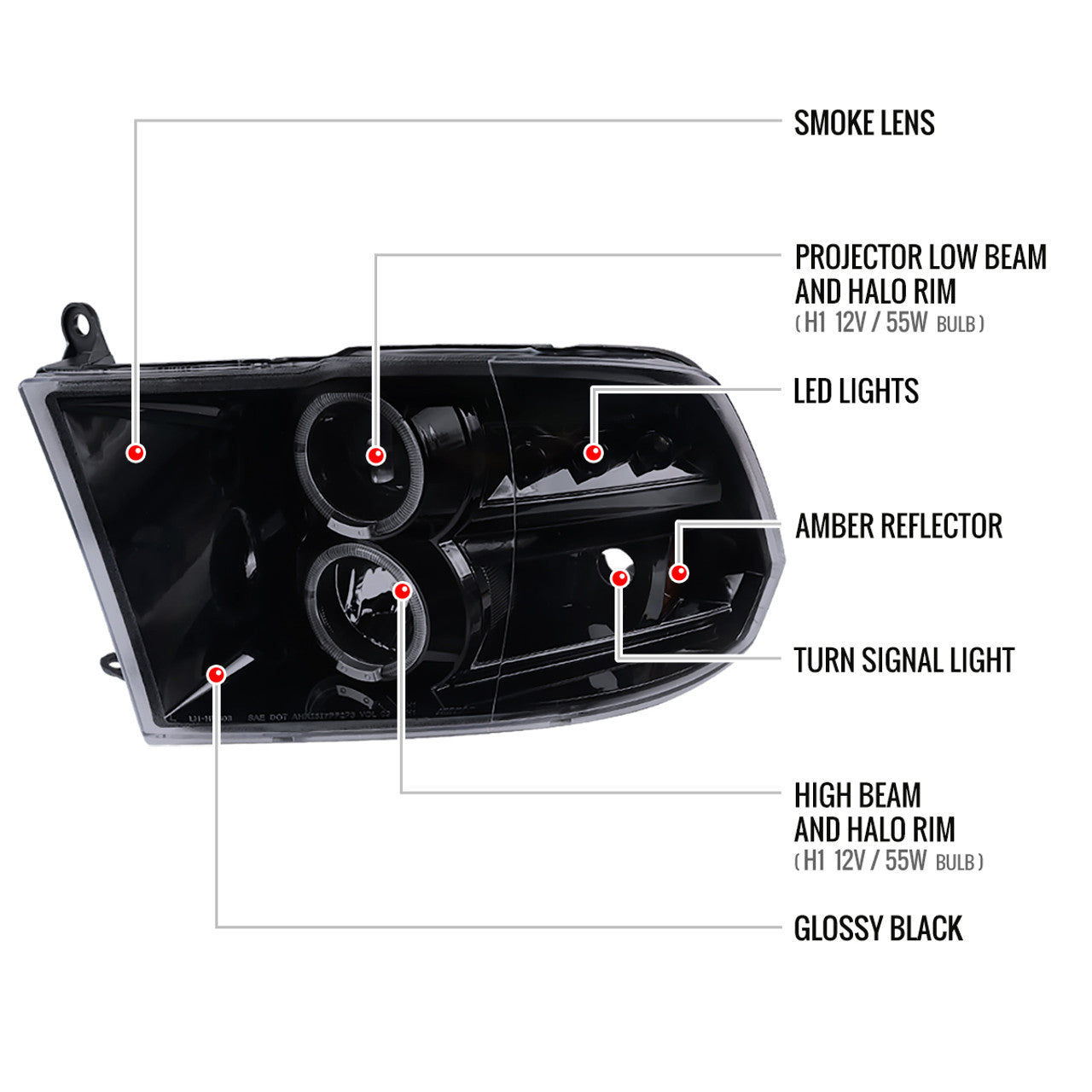 2LHP-RAM09G-TM Spec D 09-18 Dodge Ram Projector Halo Headlights (Smoke). Glossy black housing, smoke lens dual halo projector headlights with LED accent lights. H1 high beam bulbs, H1 low beam bulbs, & H13 main harness connector included.