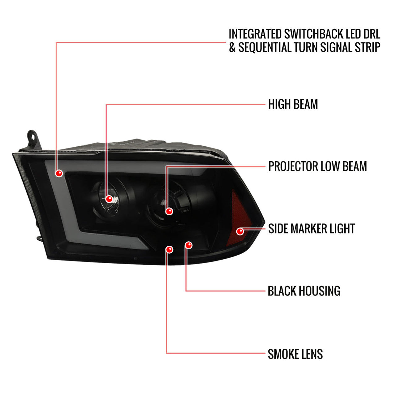 2LHP-RAM09SM-SQ-RS Spec D 09-18 Dodge Ram Projector Halo Headlights w/ Sequential Turn Signal (Smoke). Includes (1) pair of dual projector style headlights with switchback, sequential LED turn signal in black housing with smoke lens.