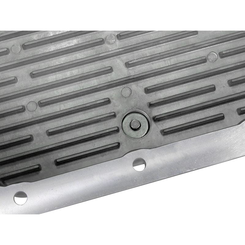 The magnetic drain plug is made from a powerful neodymium magnet, designed to attract and hold metal shavings and debris that can accumulate in the transmission fluid, preventing potential damage to internal components. Additionally, the pan includes a threaded 1/8" NPT port, allowing easy installation of a temperature sensor to monitor transmission fluid temperatures in real time.